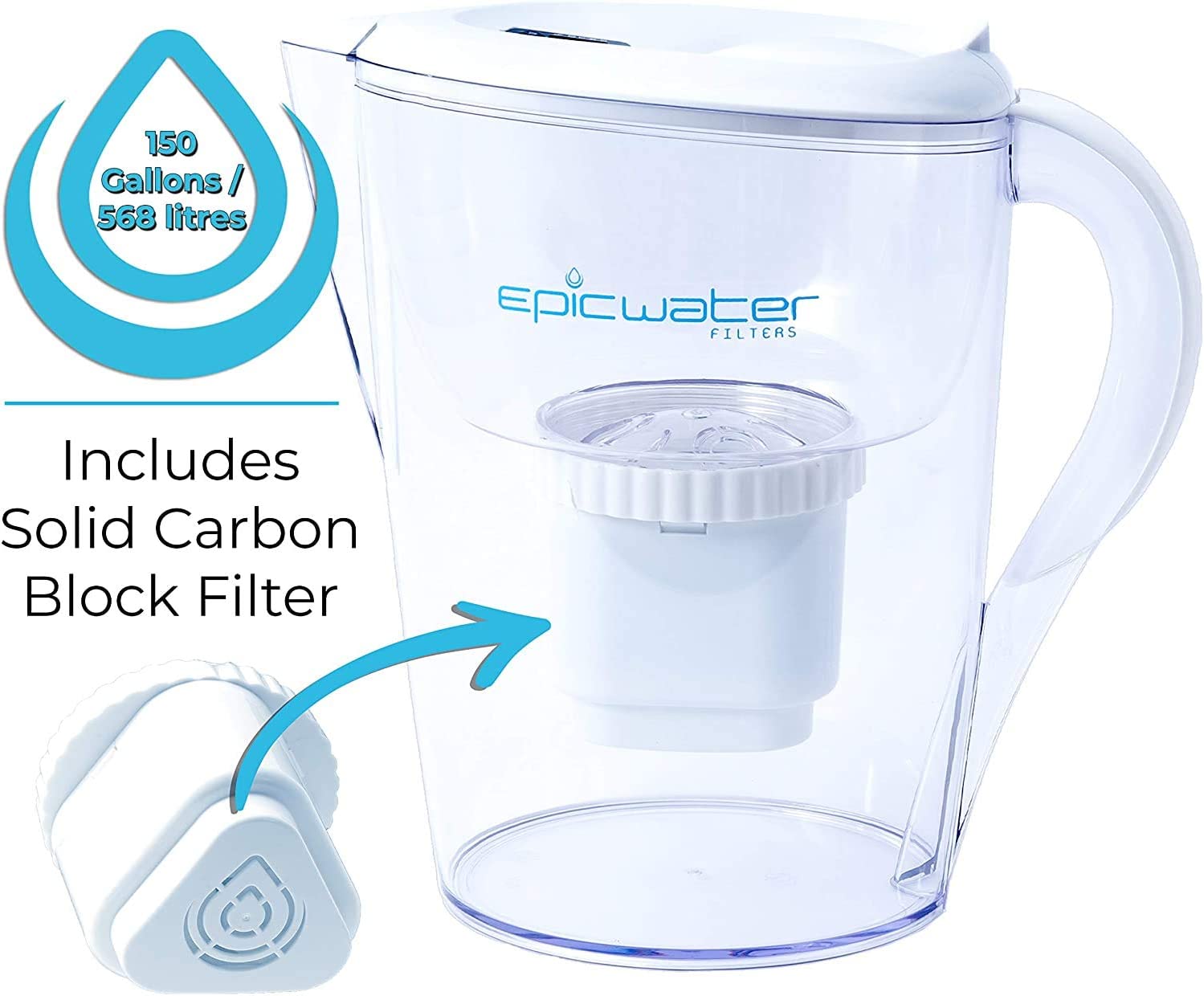 - Filtered water pitcher for refrigerator: This large water filtration pitcher for refrigerator is easy to pour and refill. This space efficient gravity water filter system jug fits perfectly on refrigerator shelves and is great for families. H 10"; W 6"; L 10"; Weight: 2 lbs. This solid carbon block water purifier pitcher with filter will keep your family drinking filtered water for years to come. Rigorously tested against NSF/ANSI standards 42, 53, 401, and P473 (NSF 53 Water Filter)