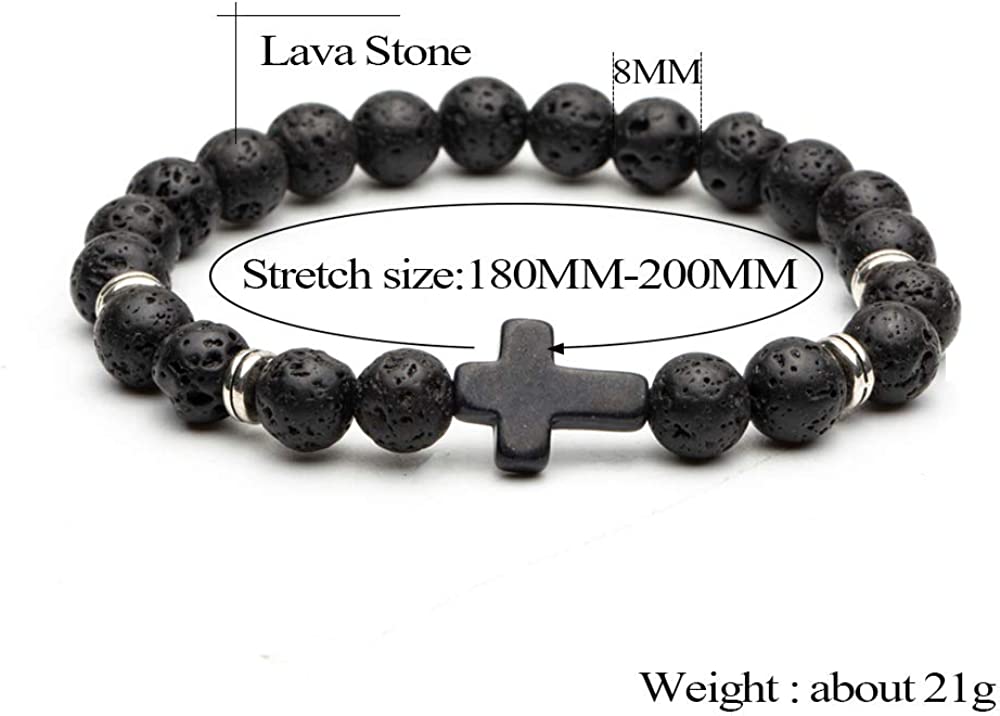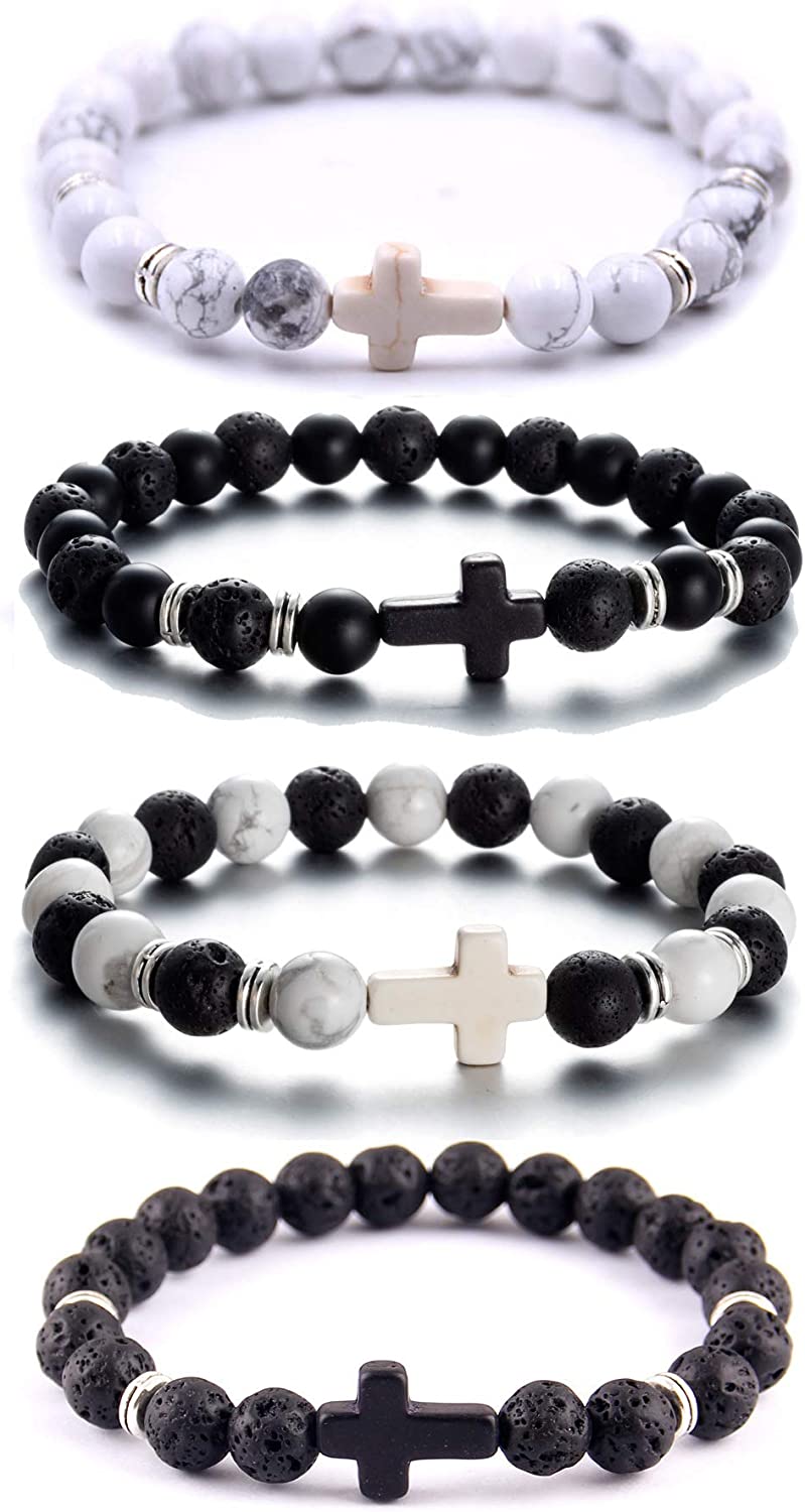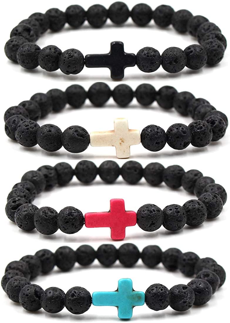 Softones 4PCS Cross Beads Bracelet for Men Women 8mm Healing Lava Stone Stretch Bracelets,7.5"