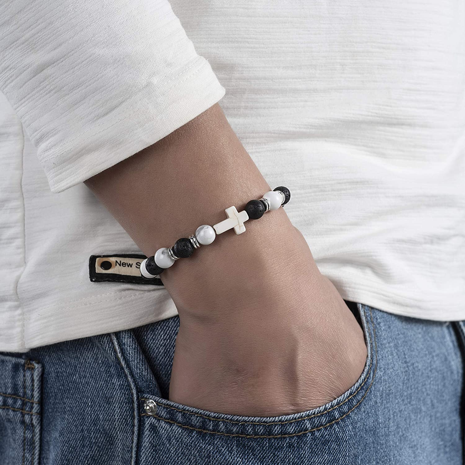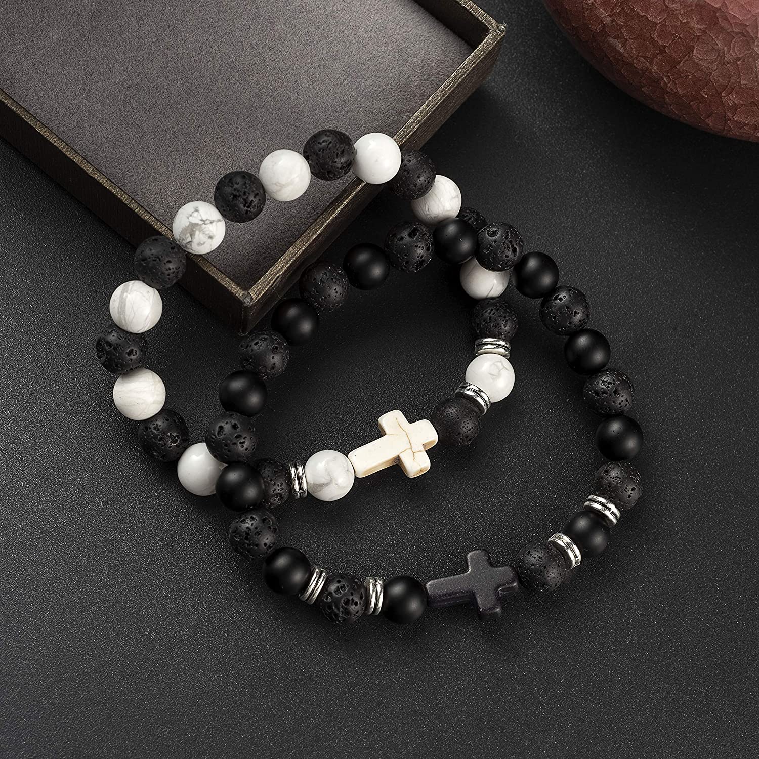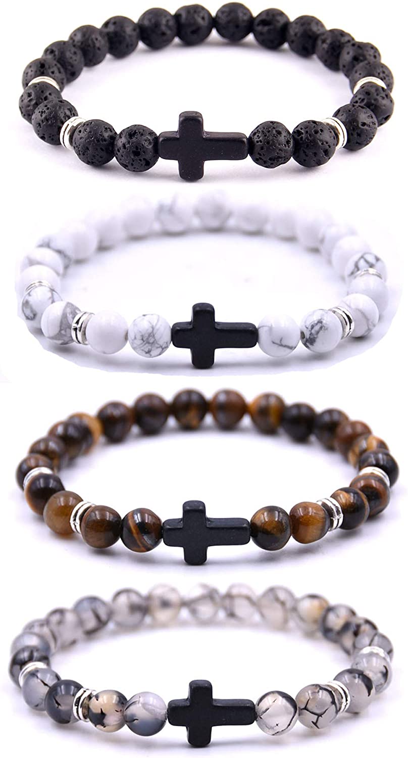 Softones 4PCS Cross Beads Bracelet for Men Women 8mm Healing Lava Stone Stretch Bracelets,7.5"