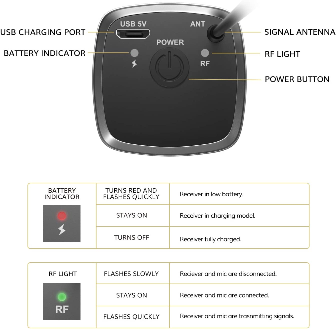• Rechargeable Battery: The rechargeable and portable receiver only needs to charge for about 2-3 hours and can be used up to 6 hours. Both mic and receiver are made of rugged metal, which has strong impact and corrosion resistance.