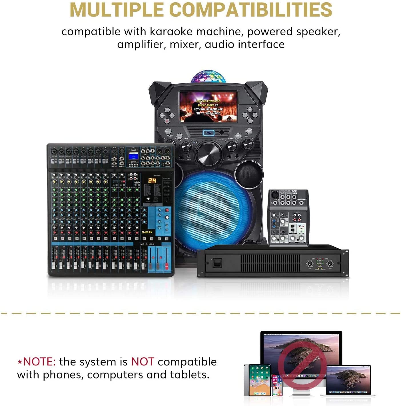 • Compatibility: Excellent signal stability, compatible with powered speaker, karaoke machine, amplifier, mixer, and audio interface. (NOTE: the system is not compatible with phones, computers, or tablets.)