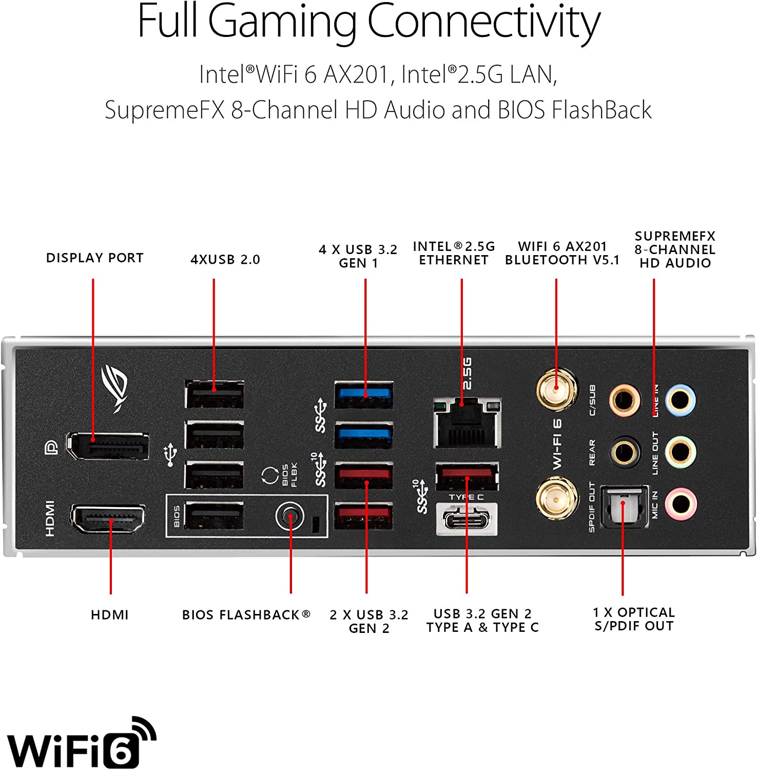 - High-performance Gaming Networking: On-board Intel WiFi 6 AX201 (802. 11 ax) and Intel 2. 5 Gb Ethernet with ASUS LANGuard