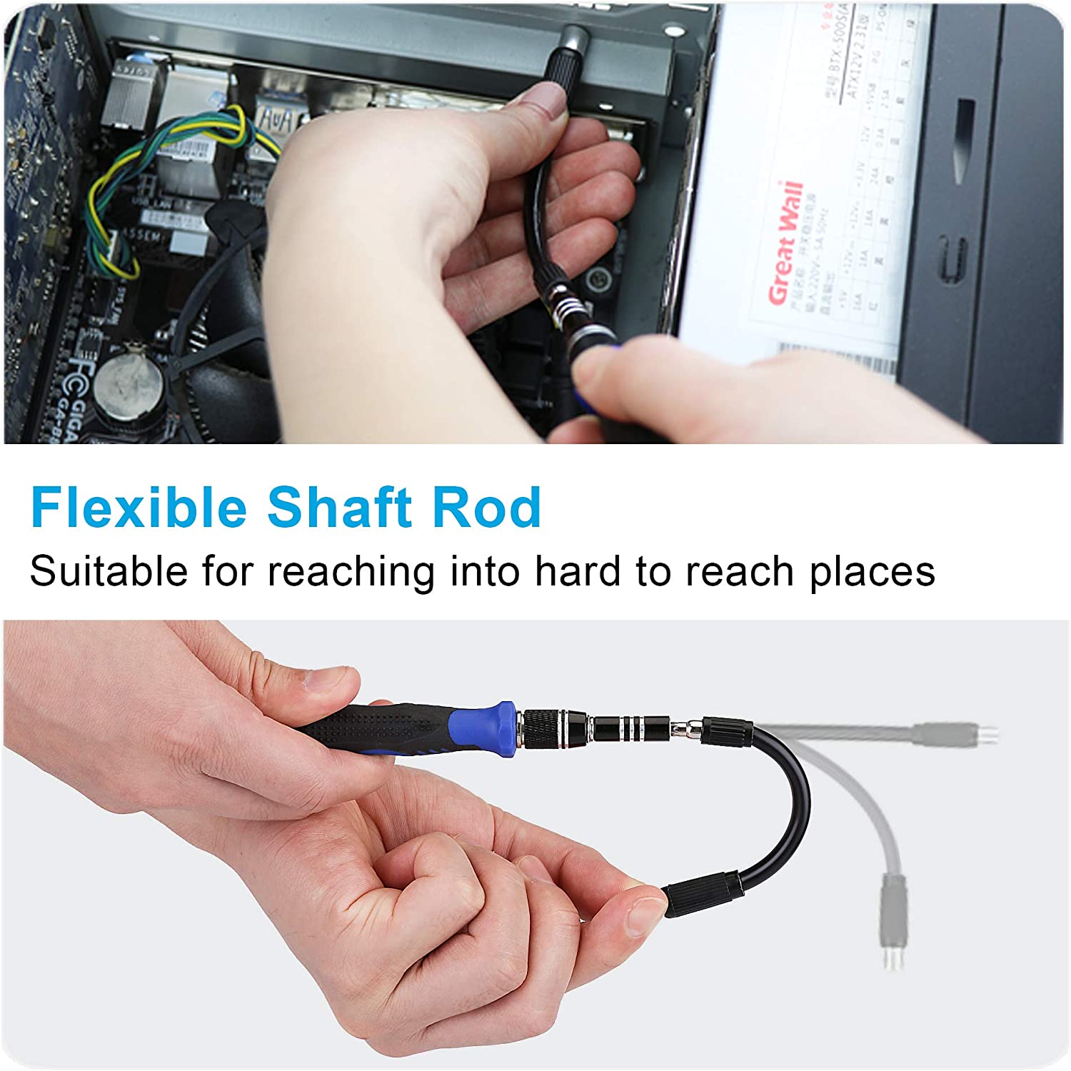 • 【Humanized Design】Ergonomic and press & push design handle, it is comfortable to hold even for the long-time use. Flexible Shaft Extension Rod and Solid Shaft Extension Rod with STRONG magnetic tips makes it easy to fix bit and pull screws out, a flexible shaft included is perfect for electronics where the shaft is hard to get, ideal for stereo work.