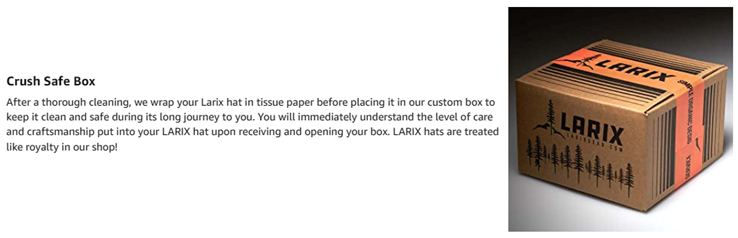 - SHIPPED IN BOX : After your hat has been cleaned and prepped we wrap your Larix hat in tissue paper before placing it in our custom box to keep it clean and safe during its long journey to you. IF YOUR HAT DOESN'T ARRIVE IN A BOX PLEASE REACH OUT TO US DIRECTLY TO LET US KNOW. You will immediately understand the level of care and craftsmanship put into your Larix hat upon receiving and opening your box.