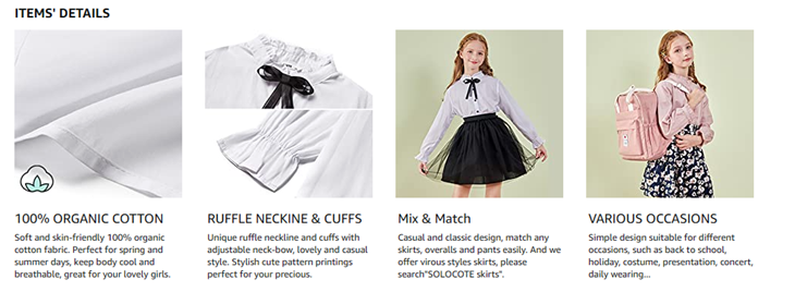 ?Ruffle decorated collar, placket and cuff ? Semicircle button of mushroom on placket