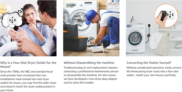 - Dryer Adapter Cord: Cleyean dryer adapter can connects the 3-prong plug of your dryer to the 4-slot outlet in your house. Nema 14-30 plug connect to the wall outlet. Nema 10-30 socket connect to your dryer plug.