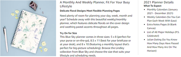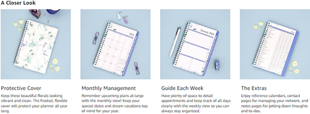 • January 2021 - December 2021 stylish day planner, featuring 12 months of monthly and weekly pages for easy year-round planning and scheduling; 6 bonus monthly pages (July 2020 - December 2020) are included
