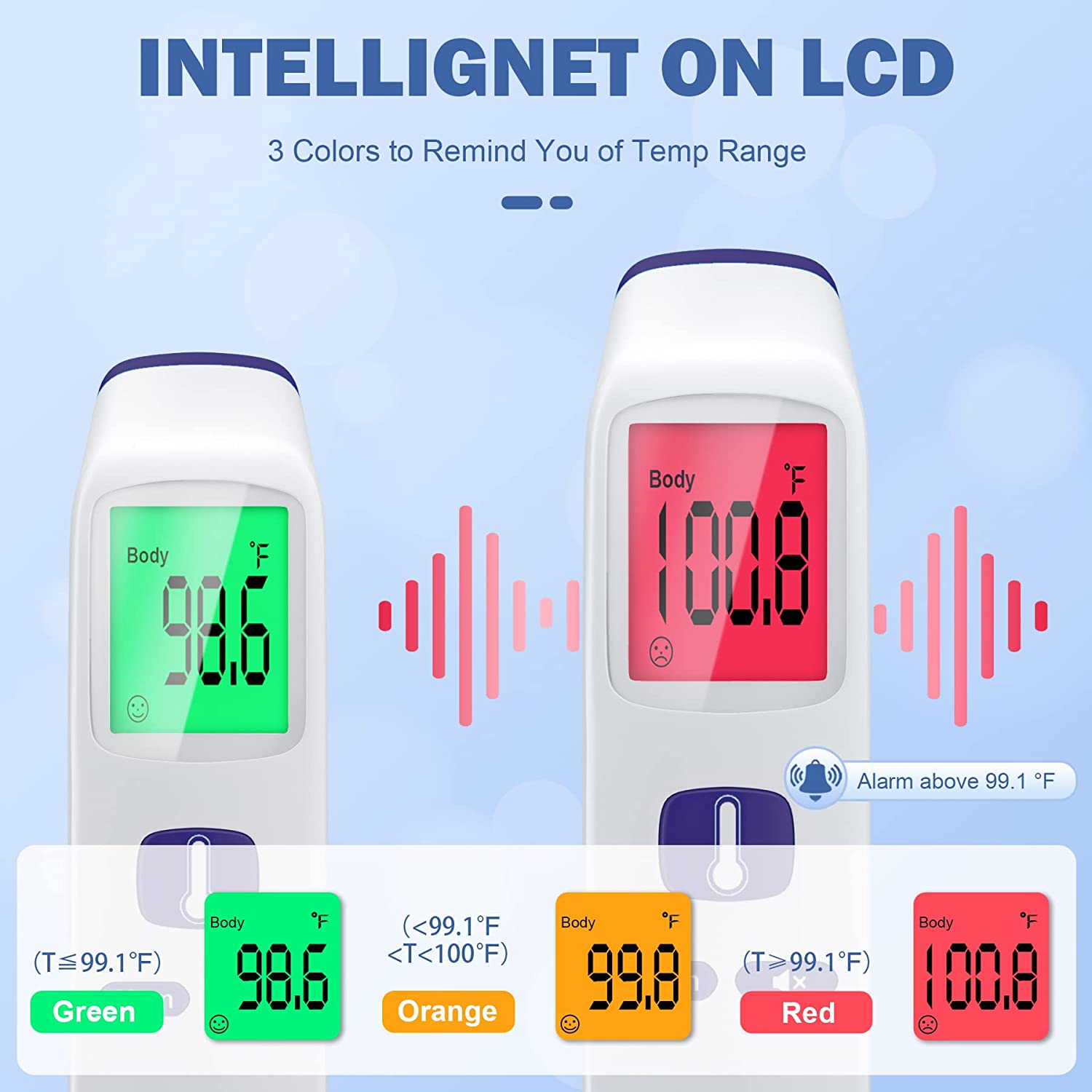 • Memory Storage & Auto Fever Alarm: The Forehead thermometer can save 35 sets of temperature readings. You can easily track the historical temperature changes. Its LCD screen has 3 different colors(green/yellow/red) according to different temperature levels. The abnormal temperature(red screen) will be accompanied by a warning sound.