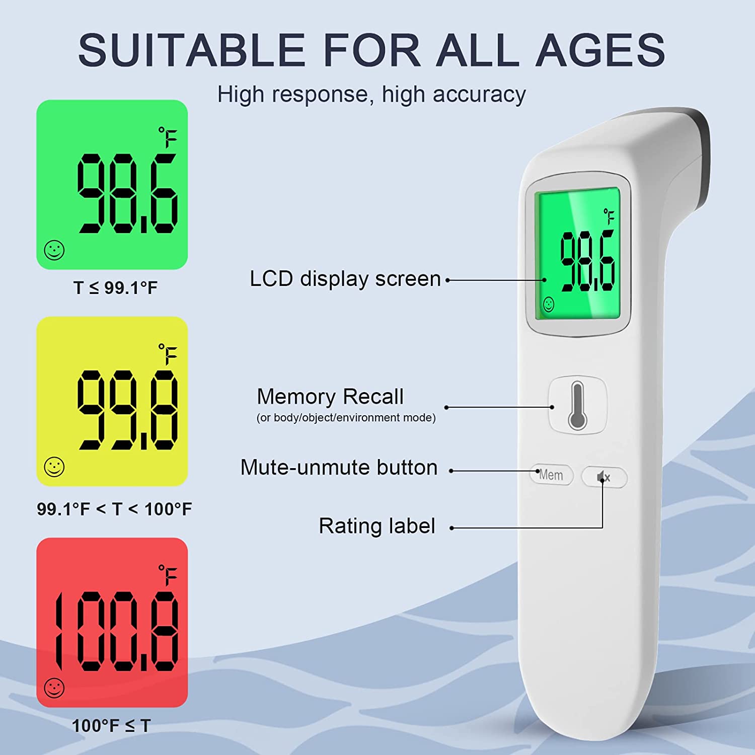 • Multi-Mode Thermometer for All Age: The thermometer for fever reads temperatures in ear and forehead for all ages, the temperature thermometer for adults, kids and infants. And it can also measure the object(water) temperature and room temperature. An ideal choice for public, hospitals, restaurants, schools, companies, homes, etc. (℃ and ℉ are easily switchable.)