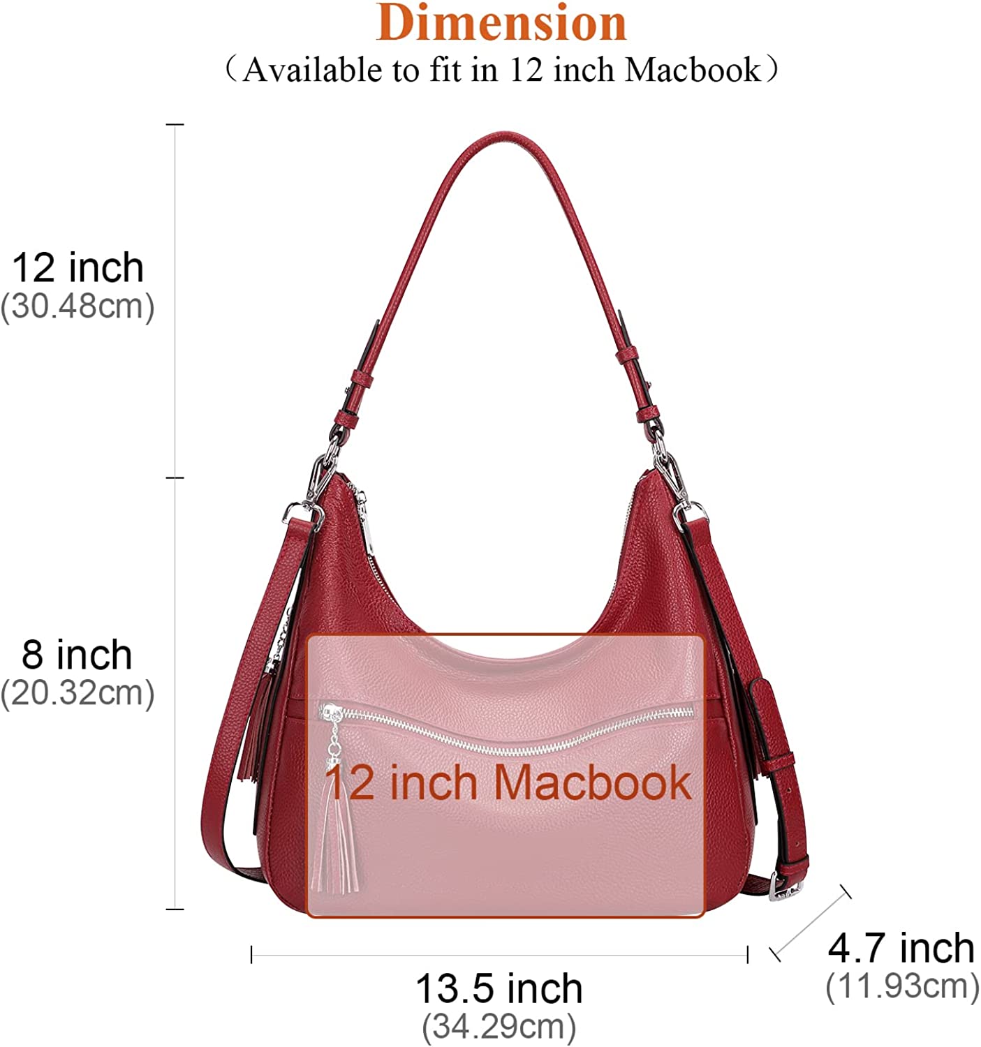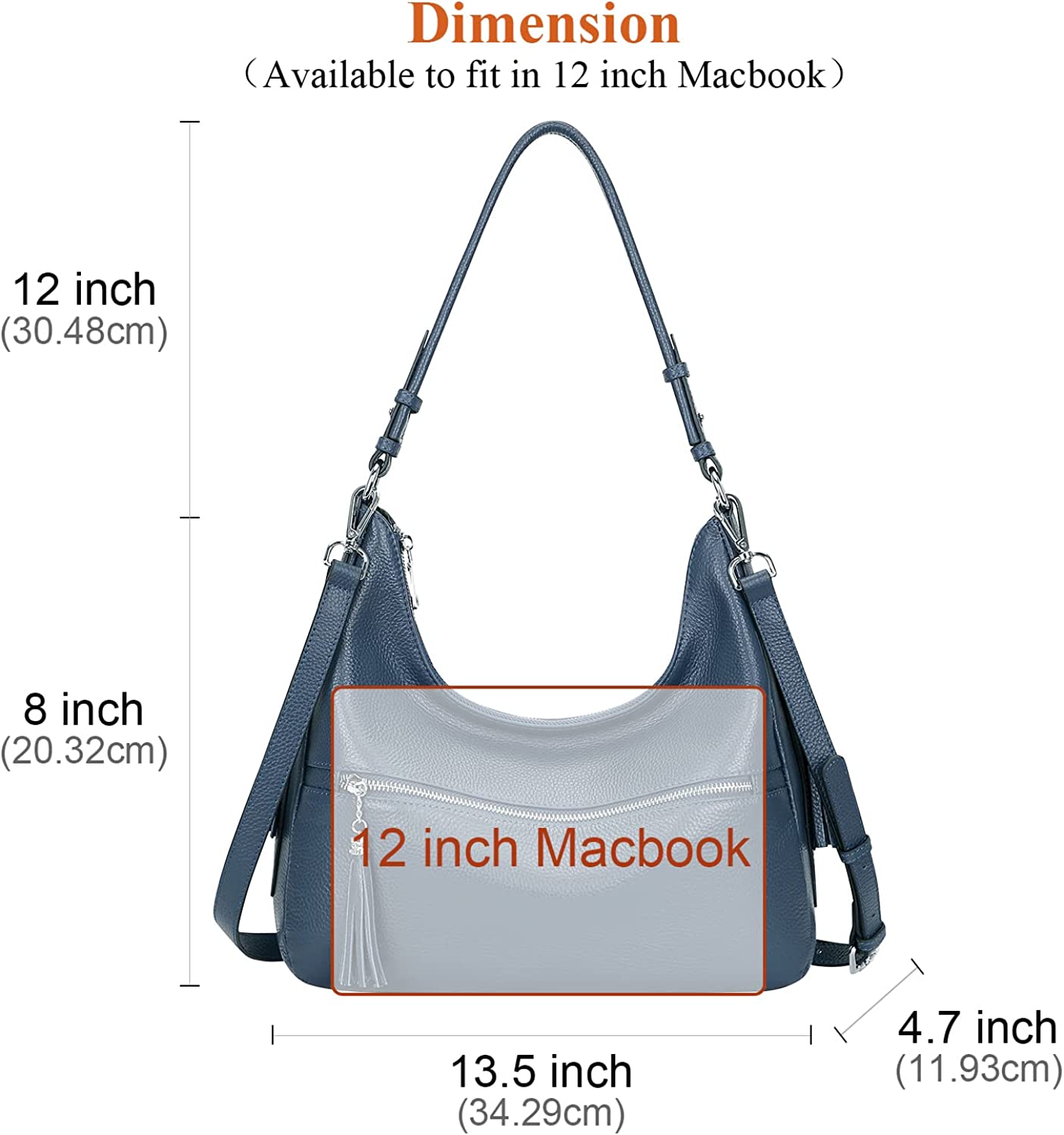 • Dimension –– Size Approx: 13.5"(L) x 4.7" (W)x 8"(H), This hobo bag can fit up to 12 inch Macbook. Please confirmed before purchased it. Detachable handles height: 11 inch. Shoulder strap: 50" length removable crossbody shoulder strap. The weight is about 1.41 pounds/0.64 kg .
