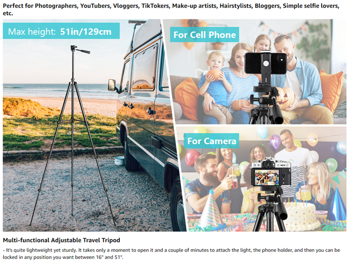 - 【Fully customizable portable tripod Stand】 Extending from 15.7 inches to 50 inches, our tripod can be adjusted to any height within seconds as needed, short enough to stand on tabletop, tall enough to fit your height. This compact circle light set comes handy when you do makeup, artworks, beauty & fashion live streaming, video calls and more.