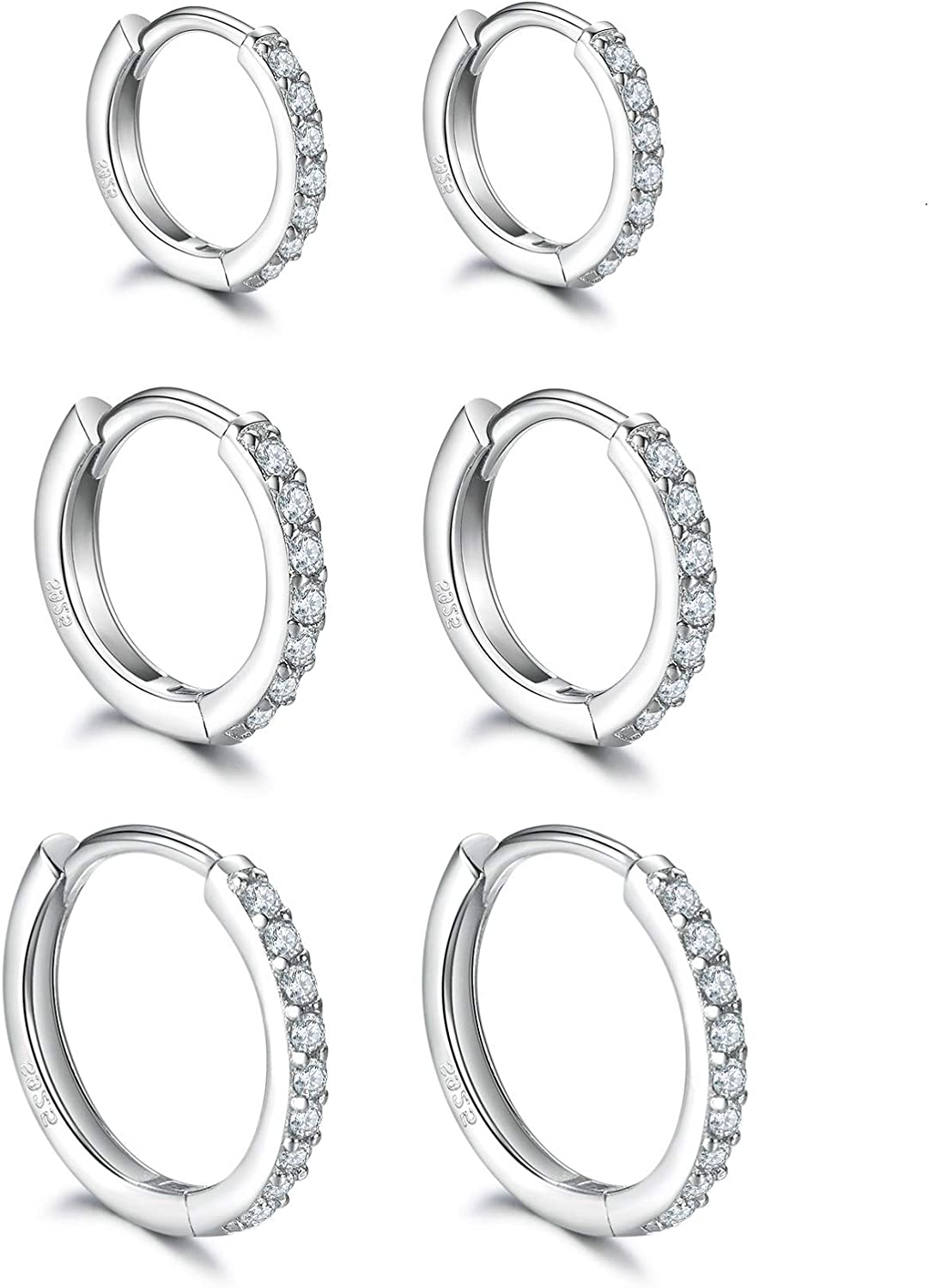 • 【PACKAGE INCLUDES】Order includes 3 Pairs 8/10/12mm(0.31/0.4/0.48in) Small Cubic Zirconia Hoop Earrings.The Small Hoop Earring is Cuff Design,Easy to Open and Close.Note:The 925 Sterling Silver Needle is very soft,Please do not Use too much Force When Opening and You can Straighten it Yourself if it bent.