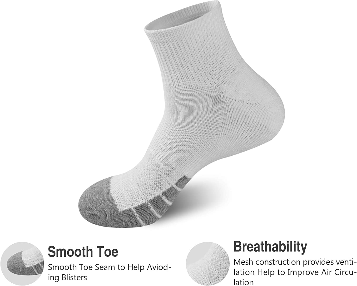 These Athletic crew socks thickened design on the soles of the feet and toes, making it more comfortable in life.With moisture wicking material you'll enjoy a secure breathable fit you can wear day after day.these crew socks made with the high-technology fabrics are engineered to provide superior Moisture Wicking Management and the Mesh Construction design on the top of socks creates airflow within the fabrics, which keeps your skin breathable and your feet cool and dry even under the toughest conditions,These socks are great to help you avoid blisters during your heavy duty work.
