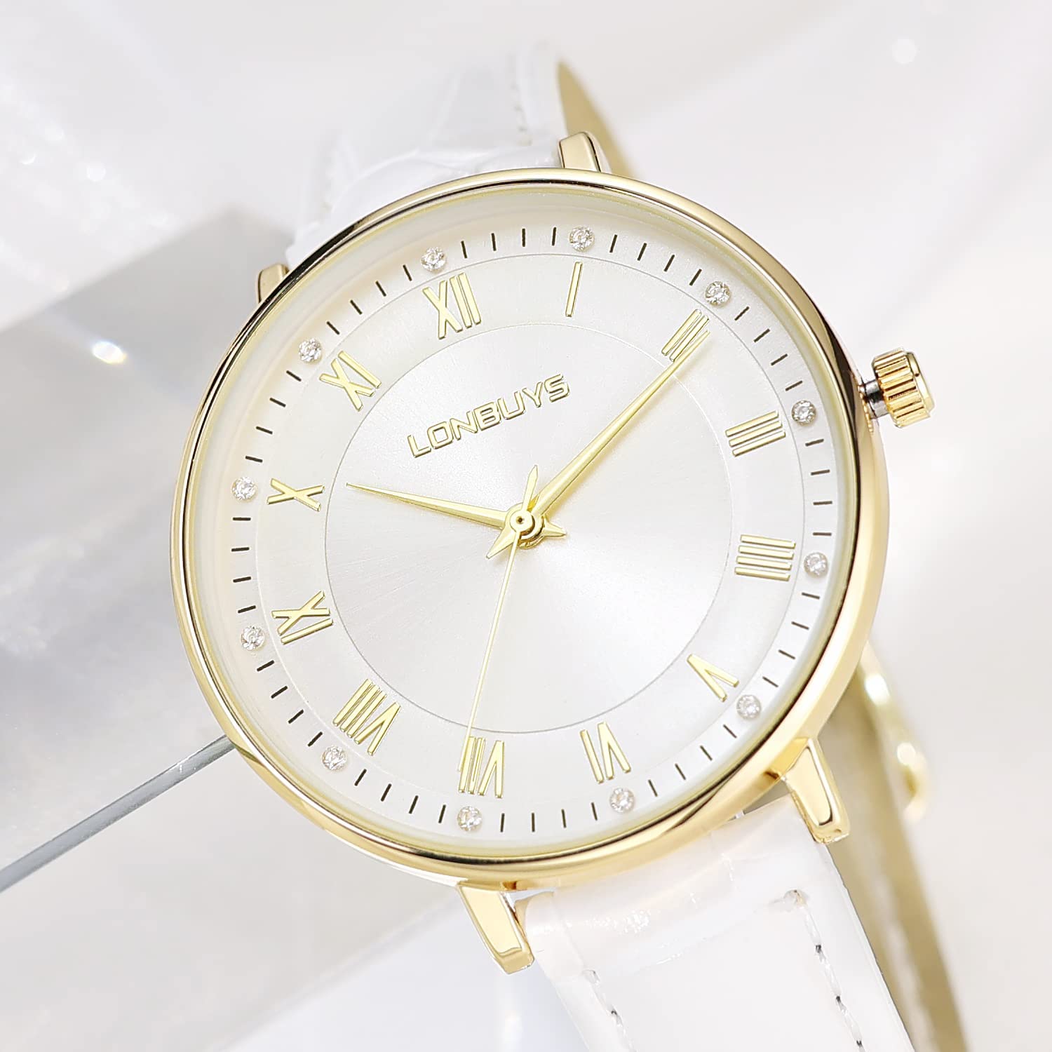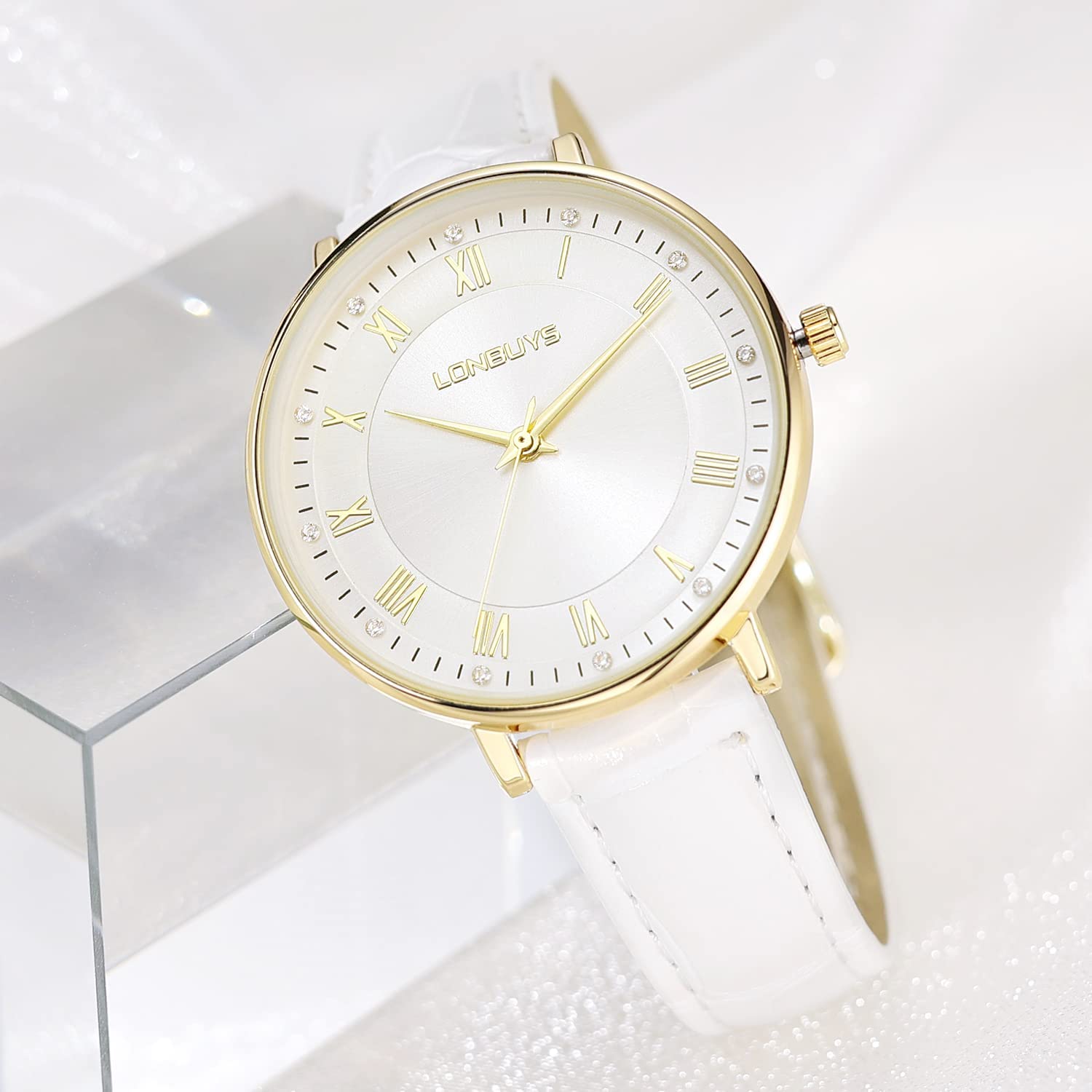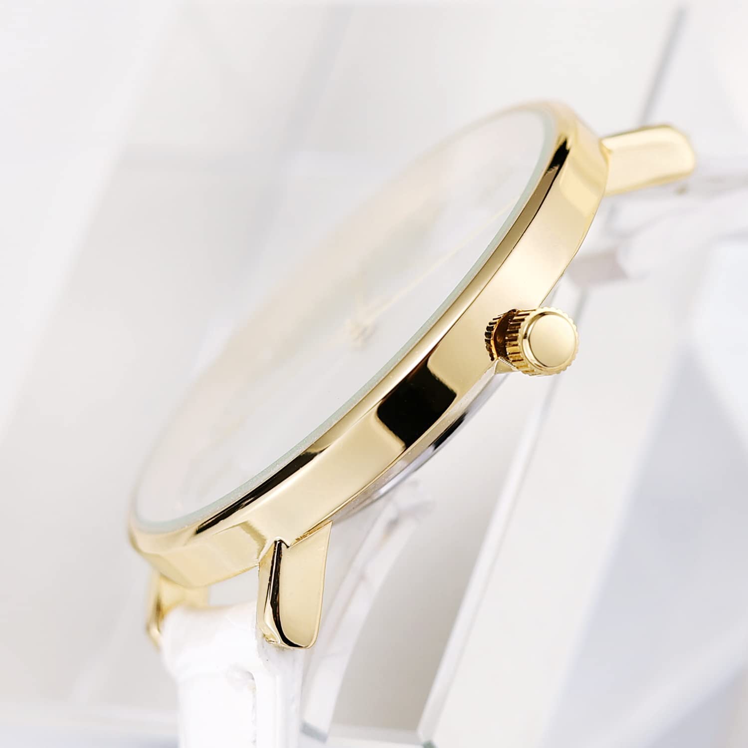 • Classic business sport style women watch,consist of a white leather strap with white watch face,Minimalist white dial with golden Arabic numerals hands and markers,Easy to reader,Perfect for a variety of outfits and occasions.