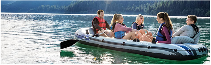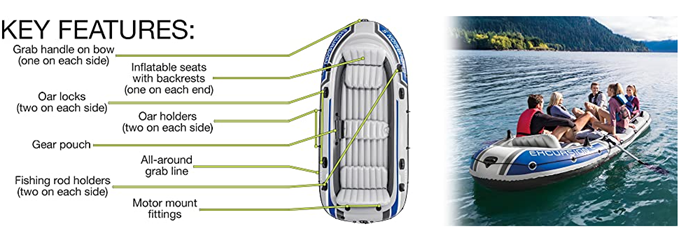 • ✔ READY FOR ADVENTURE: Great for boating or fishing with friends, this roomy Sports Series boat can fit five adults and has plenty of space for anything you need for a fun boating trip on lakes and mild rivers; NMMA and U.S. Coast Guard certified.ADVENTURE ACCESSORIES: Includes two 54-inch aluminum oars, two inflatable seats with backrests, heavy-duty grab handles with grab lines, two oar holders with welded oar locks, two quick-fill Boston valves, a high-output pump, and one repair patch kit