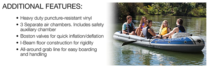 Included Components‎Intex Excursion 5, All-Around Grab Line, 5-Person Inflatable Boat Set With Aluminum Oars And High Output Air Pump, U.S. Coast Guard I.D, Repair Patch, Gear Pouch, Storage Duffel Bag