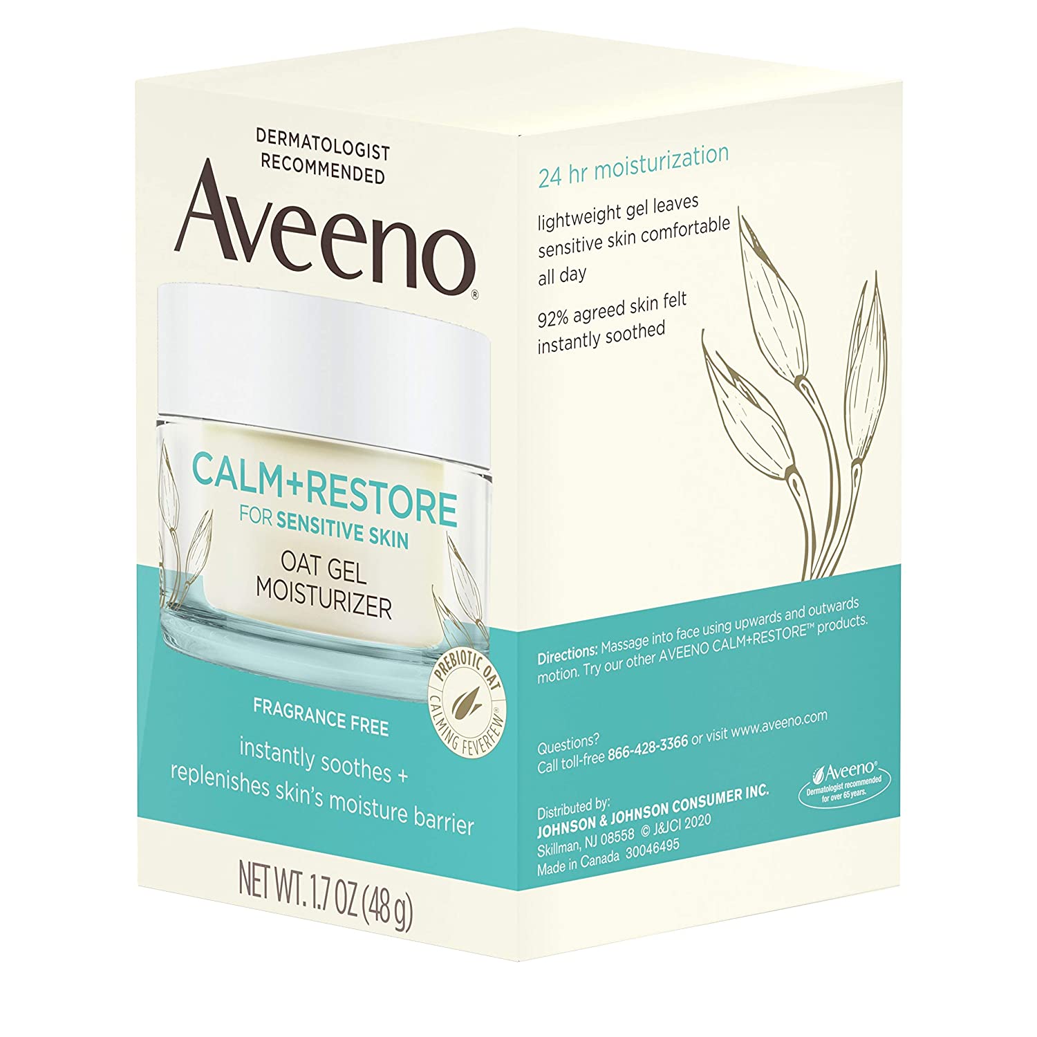• 1.7-ounce container of Aveeno Calm plus Restore Oat Gel Facial Moisturizer for sensitive and irritated, dry skin to instantly hydrate, soothe and replenish skin's moisture barrier while leaving it resilient