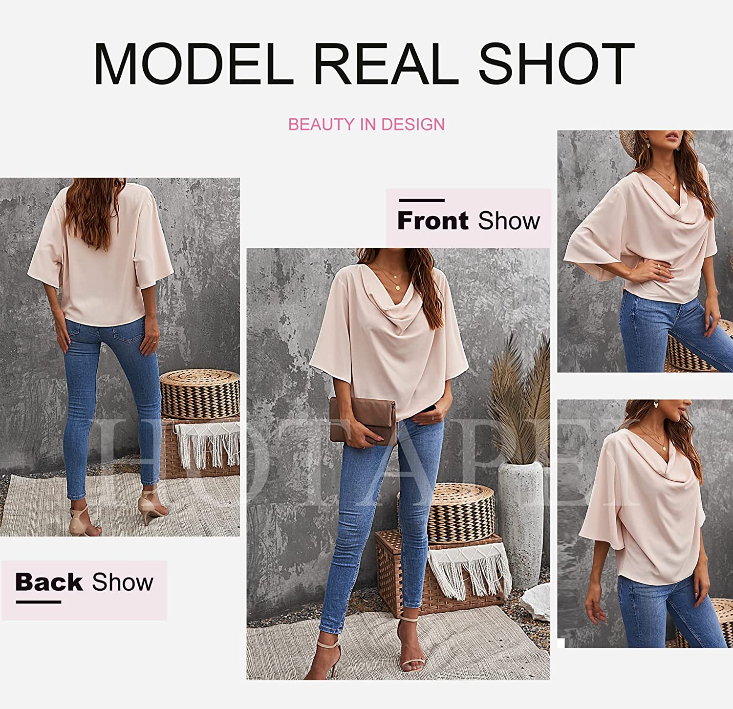 Design: Cute summer tops designed with a loosely draped front, crepey fabric.