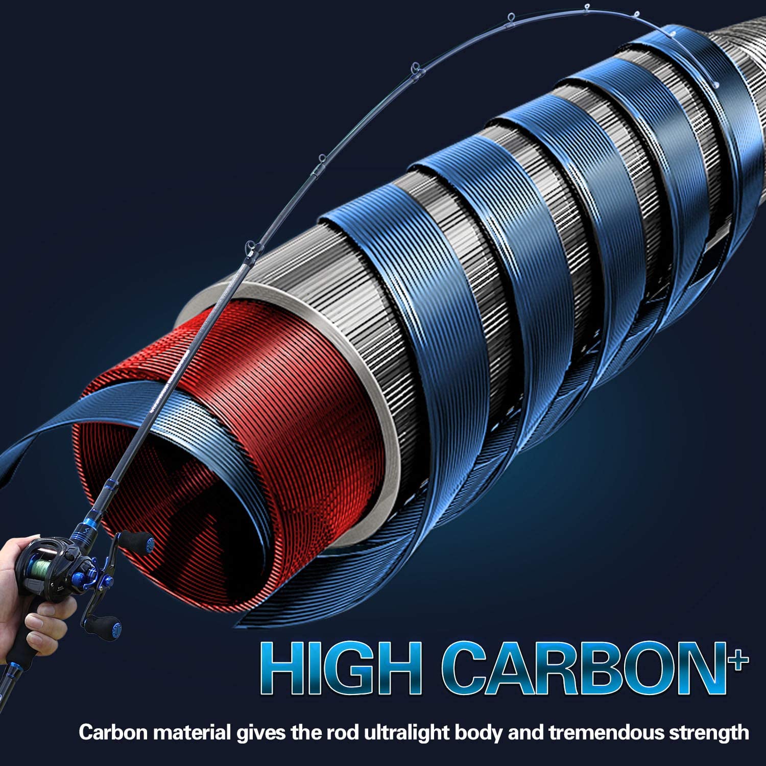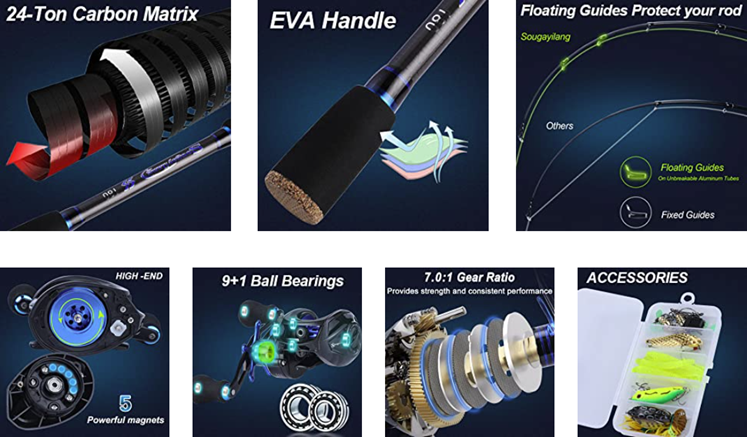 • Fishing rod: All pieces with 24-ton carbon fiber matrix technology, the lightweight casting fishing rod helps to lessen fatigue to a minimum when you are fishing. The rod with high density EVA handle with a cork, which offers firm, comfortable.
