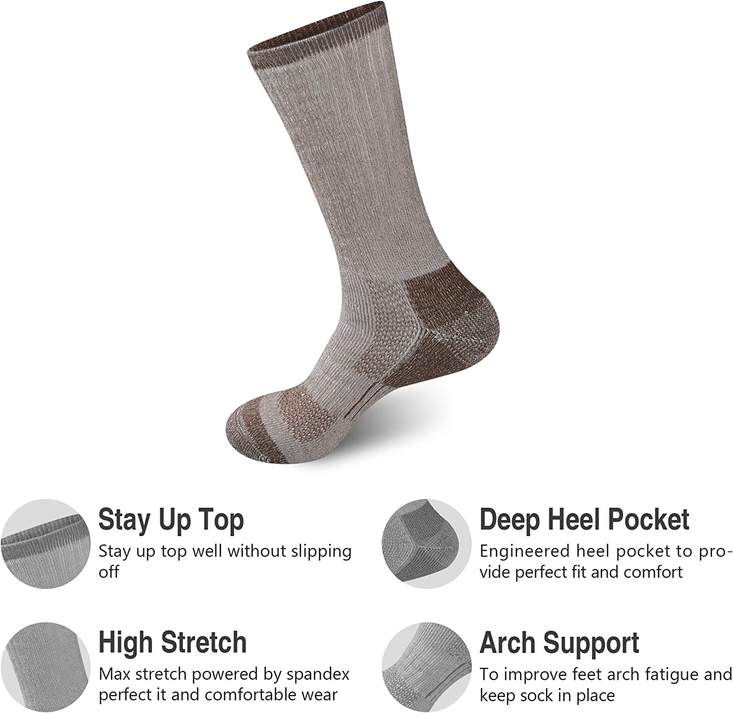 Merino Wool is a natural moisture management fiber that wicks moisture and Super soft to provides natural comfort for all seasons.Each pair is cushioned throughout and reinforced from heel to toe for maximum comfort and durability. These wool cushion crew socks designed for extreme weather conditions, great cold weather gear for outdoor activities and sports like skiing.