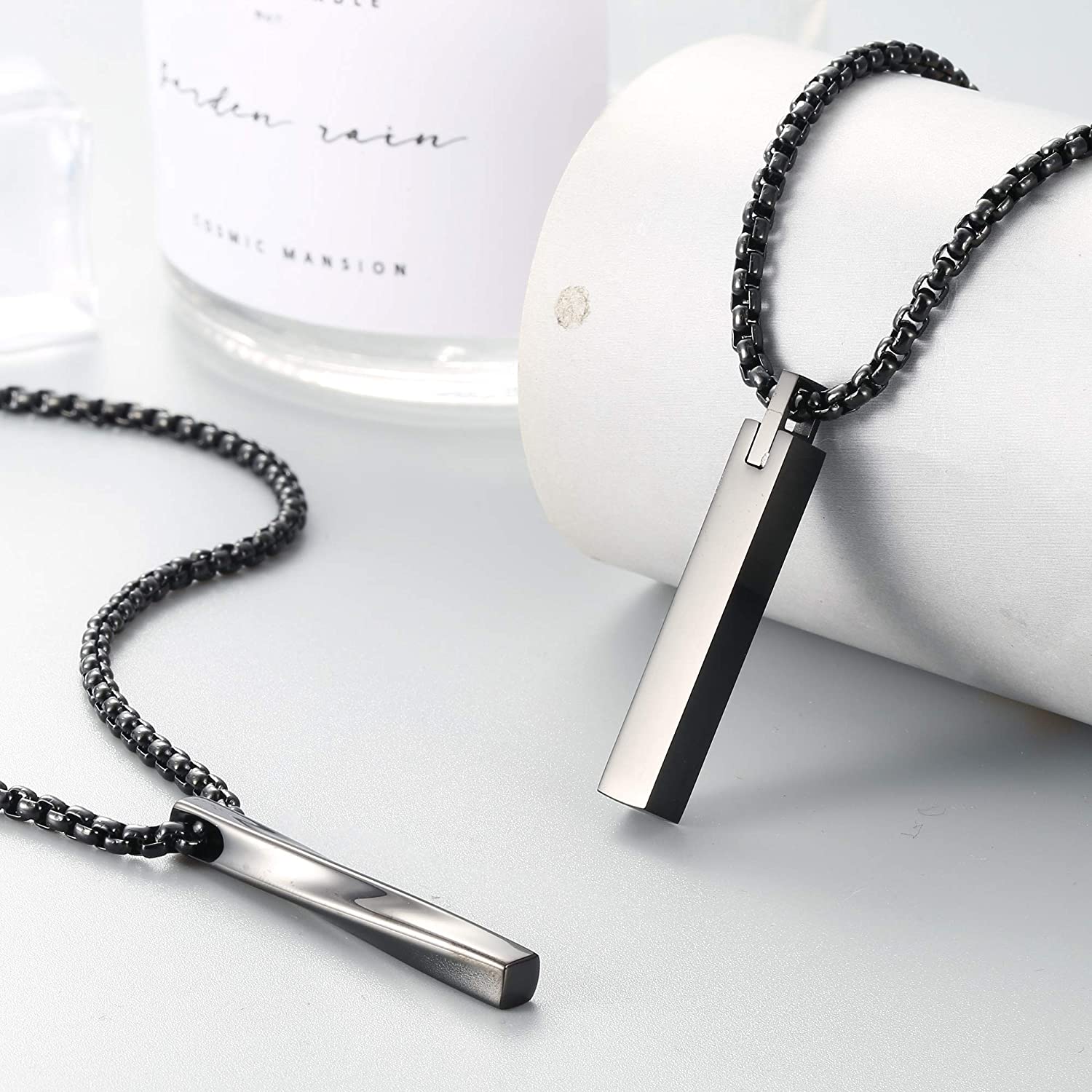 PRODUCT SIZE--Thick Bar Pendants Size: length: 40mm,width: 5.8mm,thick:5.8mm; Twisted Cube Bar Pendant Size: length: 40mm,width: 3.6mm,thick:4.6mm;All Come with a 3mm 24 inch chain. Perfect size for men and women