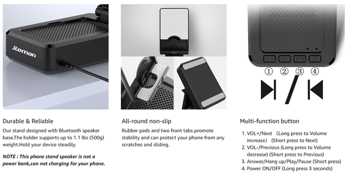 • Note:This is a super practical phone stand with Bluetooth speaker.This product does not have the function of power bank,can not charging for your phone. Before using this wireless bluetooth speaker,please use the type-c cable to connect to the power supply for charging,and read the instructions carefully.