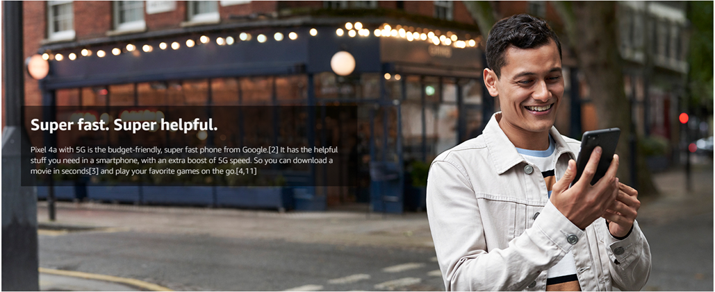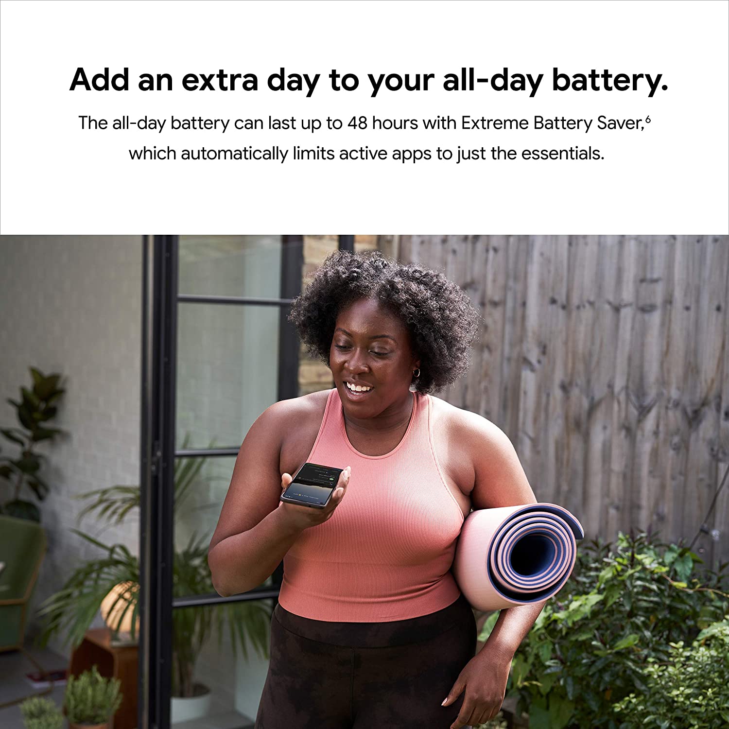 Meet Pixel 4a with 5G, the essential Google phone. It has the helpful stuff you need in a cell phone, with an extra boost of 5G speed. So you can download a movie in seconds, enjoy smooth streaming, and play your favorite games. Pixel 4a with 5G also takes amazing ultrawide photos in any light, keeps your data safe, blocks robocalls, and has an all-day battery that can last up to 48 hours with Extreme Battery Saver. It’s a lot of help from Google, for a lot less than you’d expect. And it’s an unlocked smartphone, so you can choose the data plan and carrier that work for you.[1] Works with all major carriers. Contact carrier for details. 5G service is carrier dependent.[2] Requires a 5G data plan (sold separately). 5G service and roaming not available on all carrier networks or in all areas. Contact carrier for details about current 5G network performance, compatibility, and availability. Phone connects to 5G networks, but 5G service, speed, and performance depend on many factors including, but not limited to, carrier network capabilities, device configuration and capabilities, network traffic, location, signal strength, and signal obstruction. Actual results may vary. Some features not available in all areas. Data rates may apply.[3] Download speed claims based on testing videos from three streaming platforms. Average download time was less than sixty seconds. File sizes varied between 449MB and 1.3GB. Download speed depends upon many factors, such as file size, content provider and network connection. Testing conducted in an internal 5G network lab and on pre-production hardware in California in July/August 2020. Actual download speeds may be slower.[4] Enabling gameplay with cellular data may increase your mobile data usage up to 2.7GB/hr. Gameplay is service-, network-, connection-, and game-dependent, and may not be available for all games in all areas. Users may experience inconsistent gameplay. Stadia requires account creation.[5] Hotspot capability subject to carrier plan.[6] For “All day”: Maximum battery life based on testing using a mix of talk, data, standby, and use of other features. Testing conducted on two major carrier networks using Sub-6 GHz non-standalone 5G (ENDC) connectivity. For “Up to 48 hours”: Maximum battery life based on testing using a mix of talk, data, standby, and use of limited other features that are default in Extreme Battery Saver mode (which disables various features including 5G connectivity). Testing conducted on two major carrier networks. For both claims: Pixel 4a (5G) and Pixel 5 battery testing conducted by a third party in California in mid 2020 on pre-production hardware and software using default settings, except that, for the “up to 48 hour claim” only, Extreme Battery Saver mode was enabled. Battery life depends upon many factors and usage of certain features will decrease battery life. Actual battery life may be lower.[7] Android version updates for at least 3 years from when the device first became available on the Google Store in the US. [8] US only. English only. Call Screen may not detect all spam calls.[9] Screen sharing not available on group calls. Requires Wi-Fi or 5G internet connection. Not available on all apps and content. Data rates may apply. 5G service, speed and performance depend on many factors including, but not limited to, carrier network capabilities, device configuration and capabilities, network traffic, location, signal strength, and signal obstruction.[10] Some third-party apps and data may not be transferred automatically.[11] Subscriptions may be required.[12] Compared to MSRP of unlocked Pixel 5 phone on the Google Store in the US. Requires a 5G data plan (sold separately). 5G service and roaming not available on all carrier networks or in all areas. Contact carrier for details about current 5G network performance, compatibility, and availability. Phone connects to 5G networks, but 5G service, speed, and performance depend on many factors including, but not limited to, carrier network capabilities, device configuration and capabilities, network traffic, location, signal strength, and signal obstruction. Actual results may vary. Some features not available in all areas. Data rates may apply.[13] Not available for all apps and content. Display automatically adjusts to optimize for best viewing and battery performance.[14] Qualcomm Snapdragon is a product of Qualcomm Technologies, Inc. and/or its subsidiaries. Qualcomm and Snapdragon are trademarks of Qualcomm Incorporated, registered in the United States and other countries.[16] Storage specifications refer to capacity before formatting. Actual formatted capacity will be less.[17] Qi-compatible. Wireless charger sold separately.[18] Up to 18W wired charging rates are based upon use of the included charger plugged into a wall outlet. Actual results may be slower.[19] Charging rates are based upon use of the included charger plugged into a wall outlet. Actual results may vary.[20] Designed to charge Qi-certified devices. Use of Battery Share significantly reduces Pixel battery life. Cases may interfere with charging and will reduce charging speed.