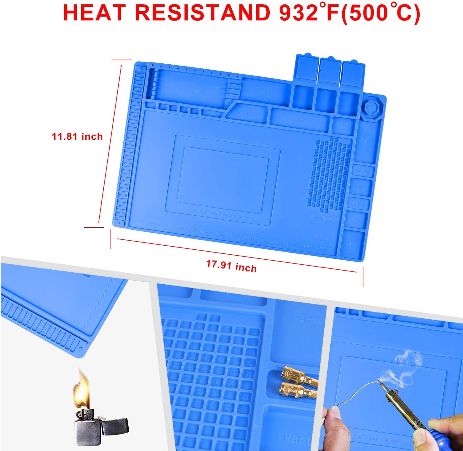 【Magnetic Anti Static Mat】The silicone heat-resistant mat can withstand high temperatures of 500°C(932°F), it is a necessary tool for electronics repair. This big ESD mat has a large enough working area, 17.8*11.8 Inches (45cm*30cm), and it has a clear functional zone, such as a magnetic zone, screw placement zone, parts store box, screwdriver zone, 36 cm scale ruler. You no longer have to worry about screw bits or small parts becoming messy or missing when you are doing DIY or repairing.