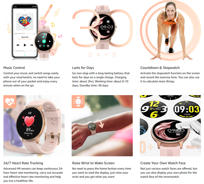 • 【Your Watch, Your Style】1.3"/33mm visible screen covered with rose gold metal frame (the whole watch face is 1.81"/46 mm), so elegant and nice, but sturdy and anti-scratch. The smart watch contains 5 dials readily available to choose from along with another 50 more dials within the app. You can also customize your watch faces. It can be any photo, such as your family, pet, etc. NOTE: THE WATCH DO NOT SUPPORT MAKE CALLS and MESSAGES.