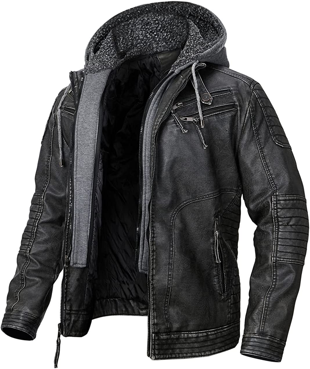 Removable knitted hood with placket and out zip closure placket provide great wind resistant, and can be worn as a stand collar motorcycle jacket