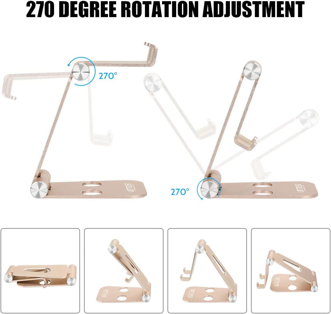 • ?【ADJUSTABLE & PORTABLE】: The phone holder is fully collapsible, Easy Carry. It can be easily adjusted to ideal position, free your hands, which is a good desk accessories while watching video, playing games, making phone call, viewing recipes, using Facetime.