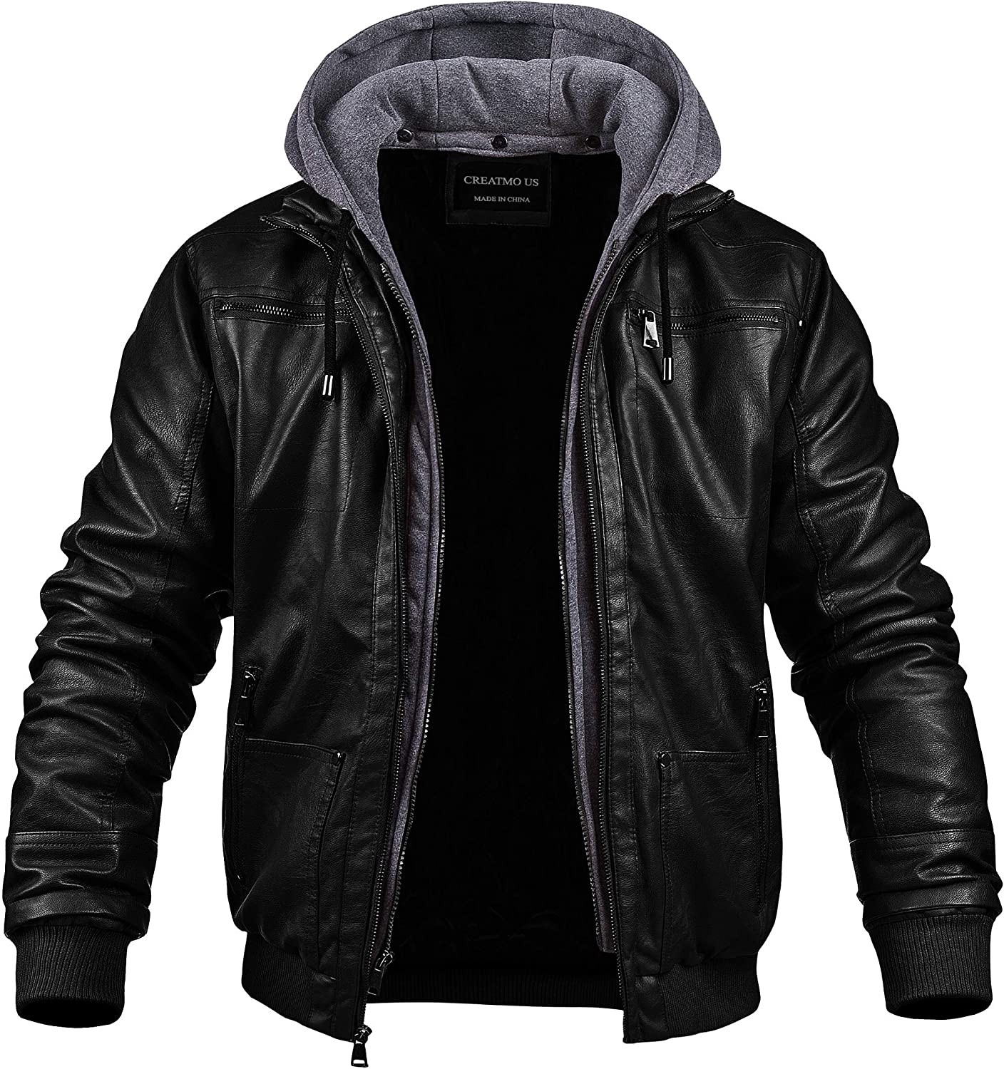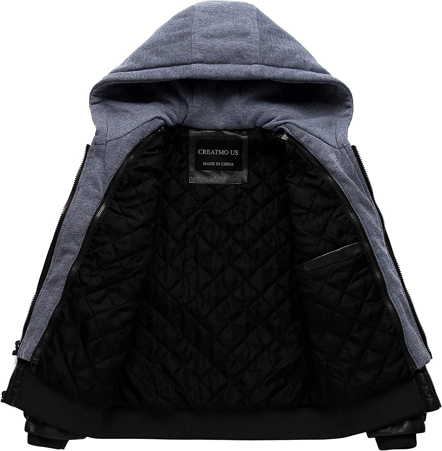 CREATMO US Men's Faux Leather Jacket Motorcycle Jacket Waterproof Windproof PU Moto Vintage Bomber Hoodie with Removable Hood