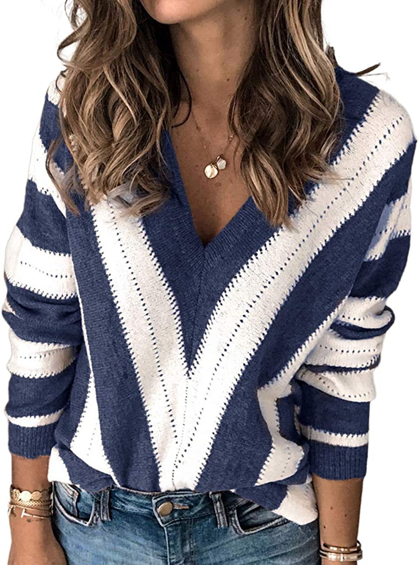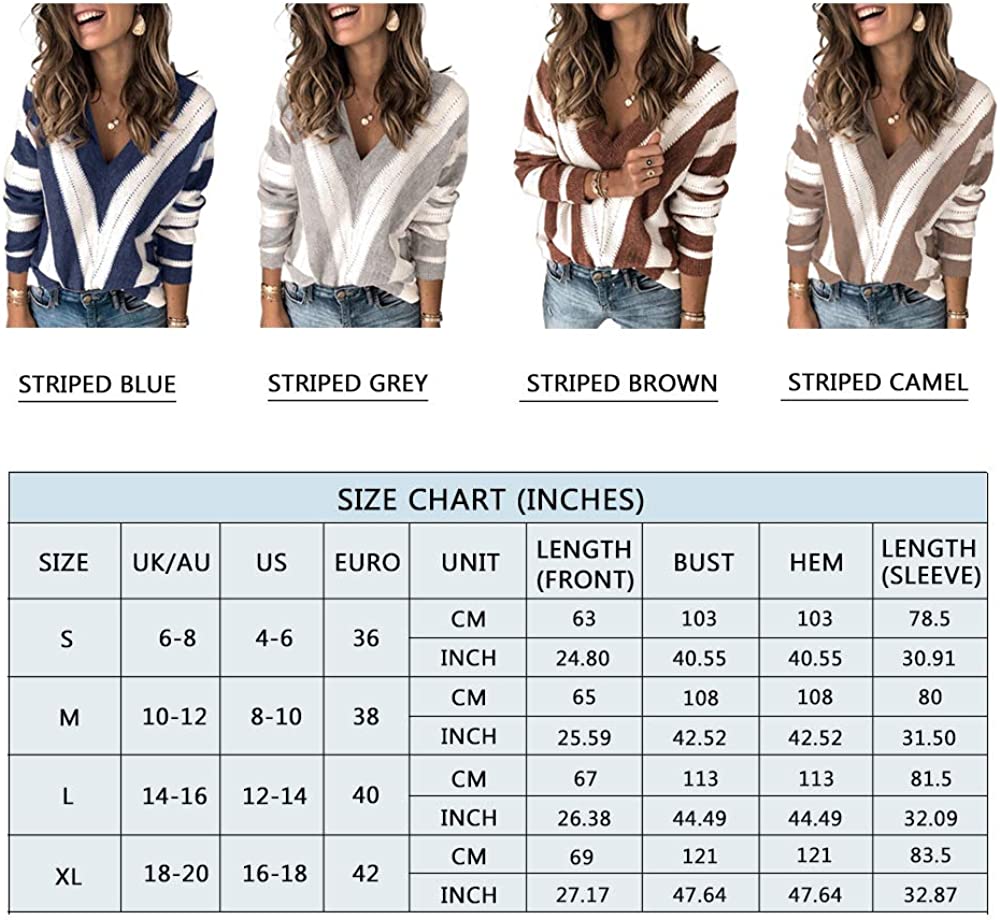 • Tips: S=US 4-6, M=US 8-10, L=US 12-14, XL=US 16-18, XXL=US 20. Design: Long Sleeve Knitted Sweater/ Striped Sweater/ Color Block Sweater/ Crew Neck Sweater/ V Neck Sweater Top/ Loose Fitting Tops For Women/ Ribbed Tops For Women/ Knitted Sweater/ Casual Sweater/ Pullover Sweaters/ Soft Sweater