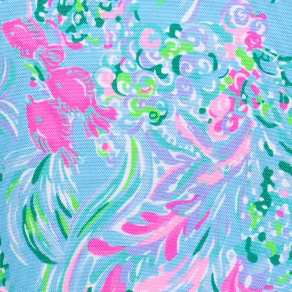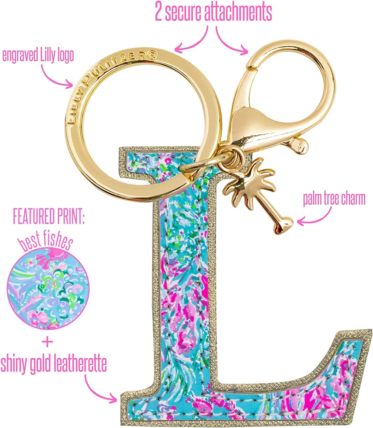 • "L" initial keychain is featured with a shimmering gold background and the bright Lilly pattern, Best Fishes, as an overlay to make gifting even more personal