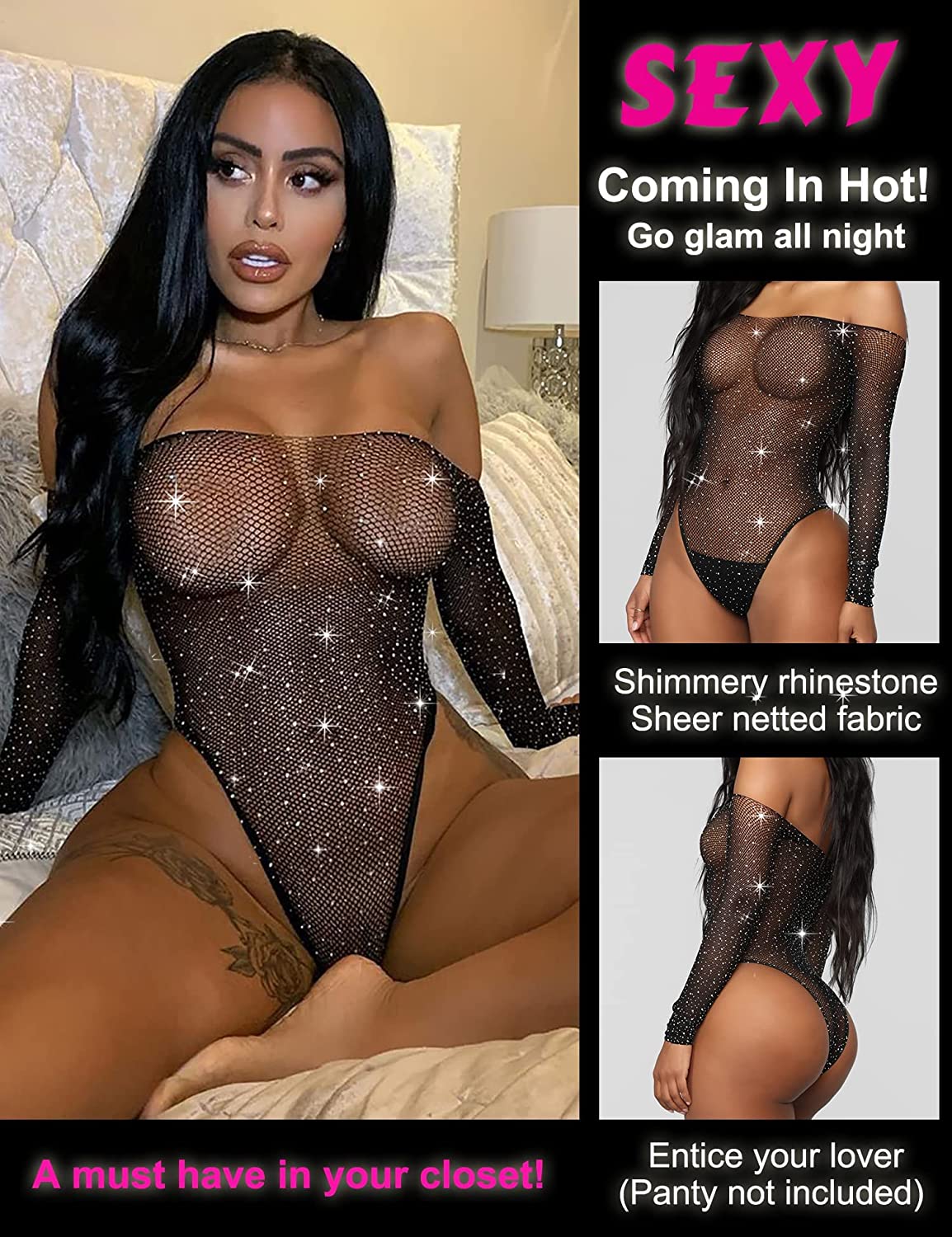 • The sparkle rhinestone fishnet bodysuit will help you show your beautiful curves, and makes you more charming.