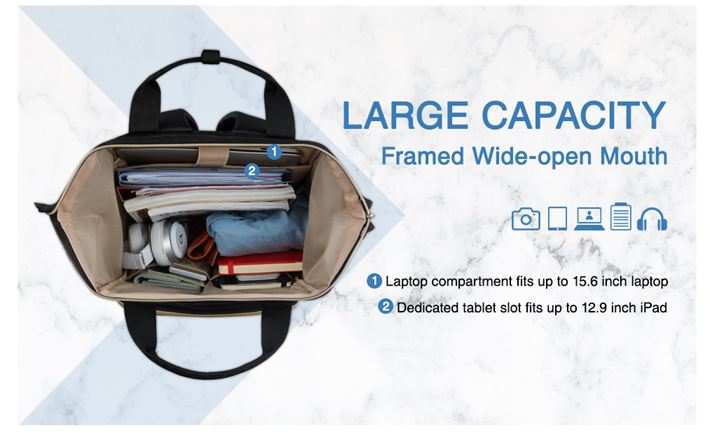 • Roomy Capacity - The laptop compartment fits up to 15.6'' laptop, tablet slot fits up to 12.9'' iPad. The large main compartment accommodates A4 folders, magazines, chargers, power bank and clothes. This back packs provide roomy capacity for your daily life, no matter you are in school, work, or travel.