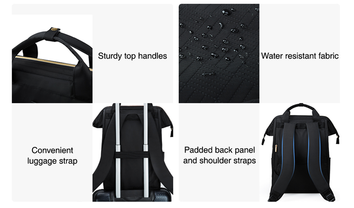 • Comfortable Backpack - "S" curve padded shoulder straps and padded back panel relieve stress of shoulder. Durable top handles and back luggage strap for easy transport. Doctor bag-style wide opening for better access.