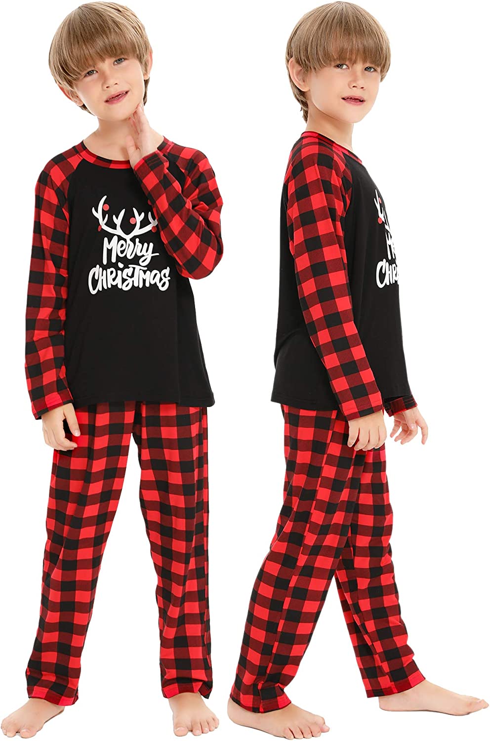 SWOMOG Matching Family Christmas Pajamas Printed Long Sleeve Tee and Plaid Pants Loungewear