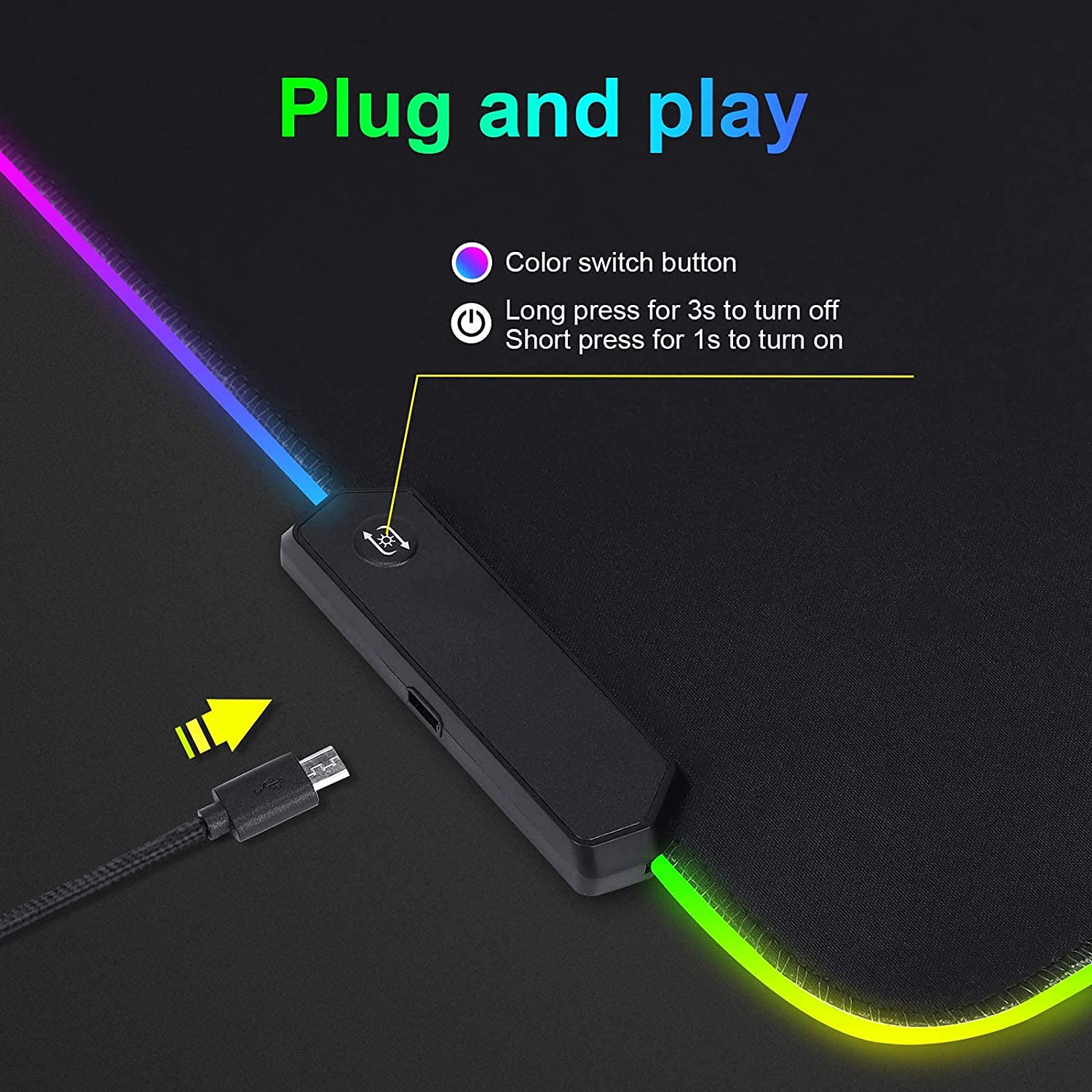 【 12 RGB Lighting Modes】 This extra-thick RGB gaming mouse pad features 9 static light modes and 3 dynamic modes.Just easily click the switch button to change colors, choose from 12 lighting modes, Breath, RGB flash, Neon Lighting, Green, Blue,Light Purple ,Red, Light Blue,Yellow,White,Purple,Orange.