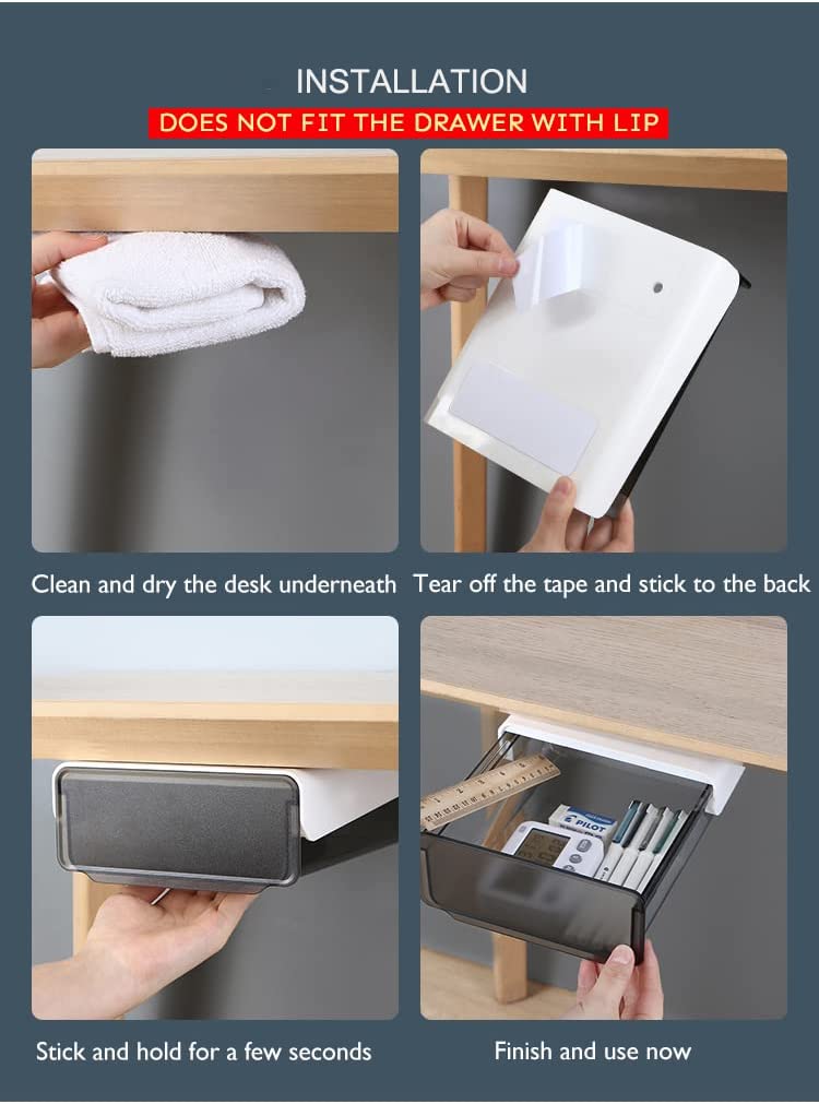 【Self Adhesive & Easy to Install】With four strong-power self-adhesive tapes, this under desk drawer organizer is easy to mount to the clean surface tightly and will not drop-off. Screws are also included if the tapes do not work.You can choose a suitable location, choose a smooth panel, and paste our drawers.Please hot the tape with a hair dryer first or use some degumming agent and rip it off if you want to remove the drawer.