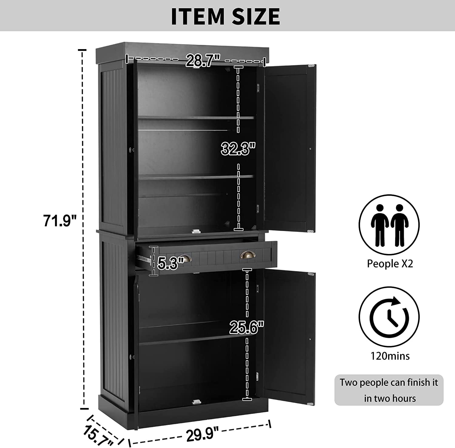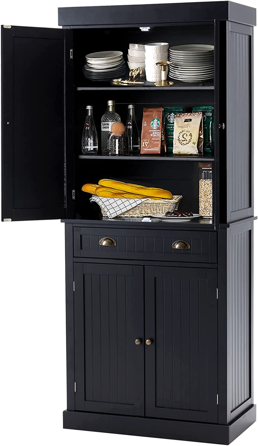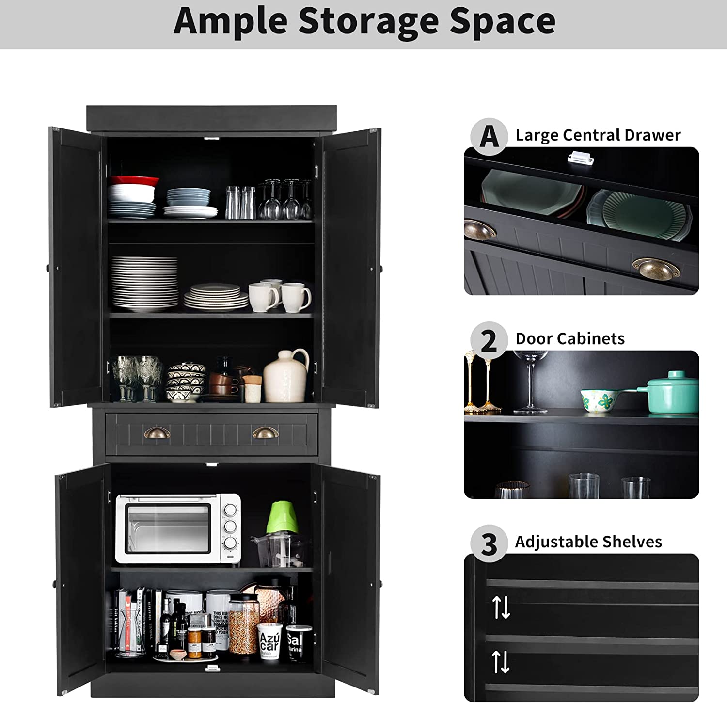 【STORAGE SPACE TO MEET DEMAND】This kitchen pantry is equipped with a large drawer and 2 double-door cabinets. There are three adjustable shelves inside the cabinet, and you can easily adjust the height of the shelves according to the different items you need to place. Different heights can meet the placement needs of various items. The drawer is equipped with smooth sliding rails, which can be easily opened and closed. You can put dishes, books and other small items in the spacious drawer.