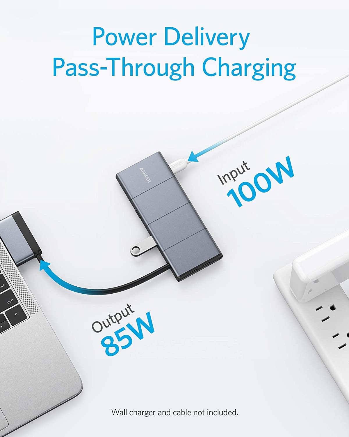 Plug the hub into your laptop and then connect your Power Delivery wall charger to the USB-C input port to get up to 85W of charging power.