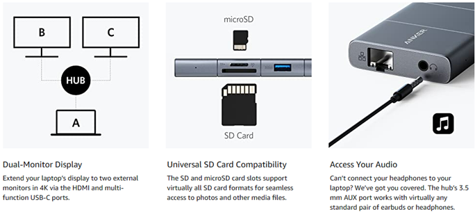 • 9-in-2: Plug the 2 USB-C connectors into your MacBook to expand to a multi-function USB-C port, a USB-C Power Delivery input port, an HDMI port, 2 USB-A 3.0 ports, an Ethernet port, an AUX port, and SD/microSD card slots.