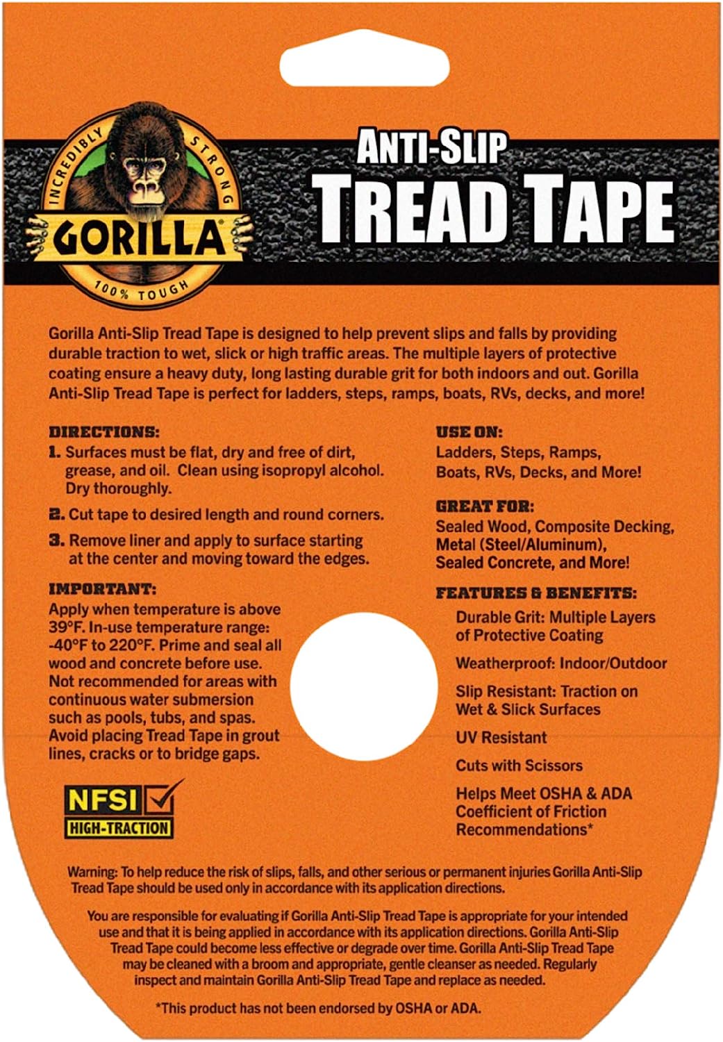 Gorilla Heavy Duty Tread Tape is designed to provide durable traction to wet, slick or high traffic areas. The multiple layers of protective coating ensure long lasting, durable grit that lasts both indoors and out. Gorilla Heavy Duty Tread Tape is perfect for ladders, steps, ramps, boats, RVs, decks, and more! DIRECTIONS: 1. Surfaces must be flat, dry and free of dirt, grease, and oil. Clean using isopropyl alcohol. Dry thoroughly. 2. Cut tape to desired length and round corners. 3. Remove liner and apply to surface starting at the center and moving toward the edges. IMPORTANT: Apply when temperature is above 39° F. In-use temperature range: -40° F to 220° F. Prime and seal all wood and concrete before use. Not recommended for areas with continuous water submersion such as pools, tubs, and spas. Avoid placing Tread Tape in grout lines, cracks or to bridge gaps. Warning. To help reduce the risk of slips, falls, and other serious or permanent injuries Gorilla Heavy Duty Tread Tape should be used only in accordance with its application directions. You are responsible for evaluating if Gorilla Heavy Duty Tread Tape is appropriate for your intended use and that it is being applied in accordance with its application directions. Gorilla Heavy Duty Tread Tape could become less effective or degrade over time. Gorilla Heavy Duty Tread Tape may be cleaned with a broom and appropriate, gentle cleanser as needed. Regularly inspect and maintain Gorilla Heavy Duty Tread Tape and replace as needed.