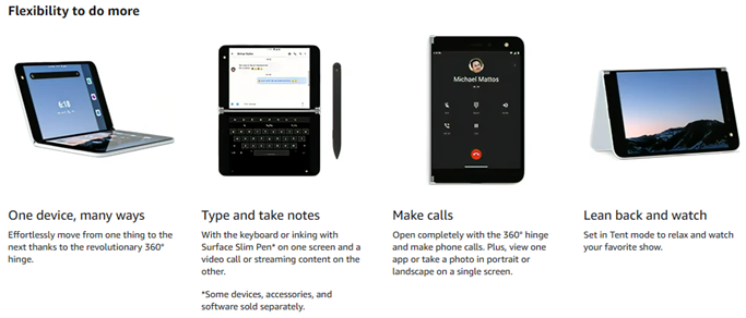 Two ultra-thin, high-resolution touchscreens open to reveal new possibilities on a mobile device. Designed to help you be productive, Surface Duo features multiple modes, the best of Microsoft 365 mobile experiences, every Android app in the Google Play store, and new dual-screen enhanced apps. Now you can view two apps at once or span one across both screens, drag and drop between screens, and make phone calls. Say goodbye to constant app switching.