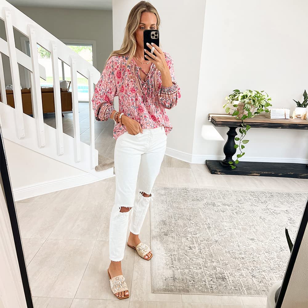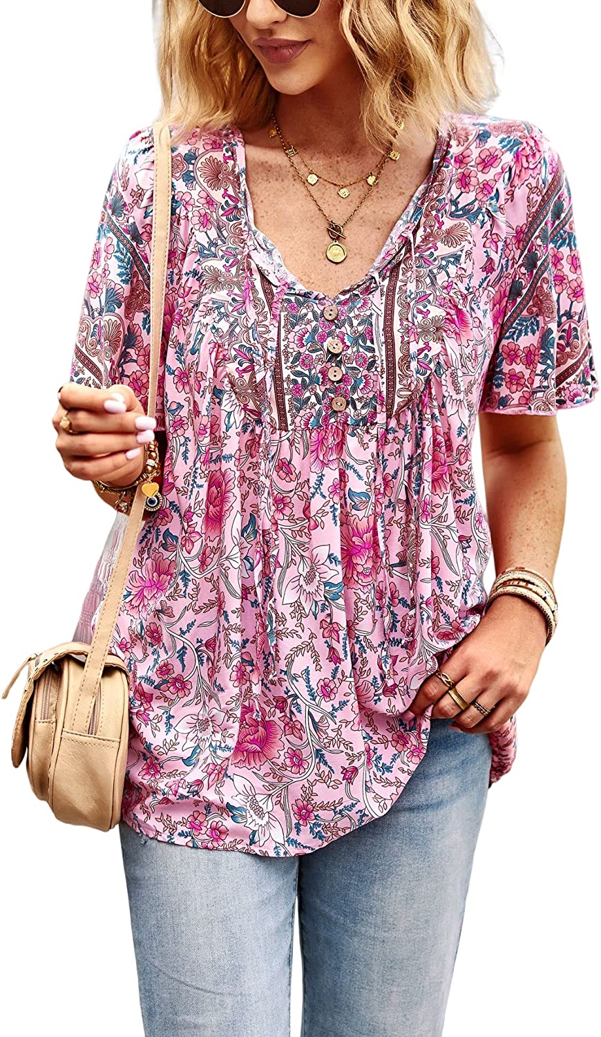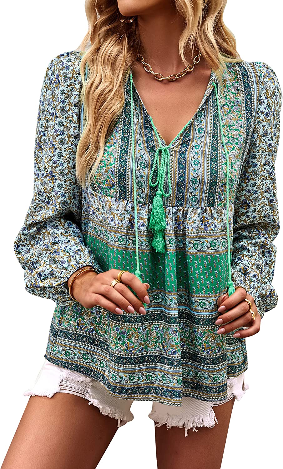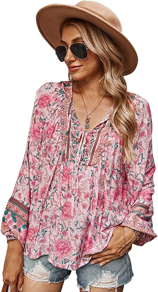 KAYWIDE Women's Casual Boho V Neck Top Loose Floral Printed Long Sleeve Beach Shirts Blouses