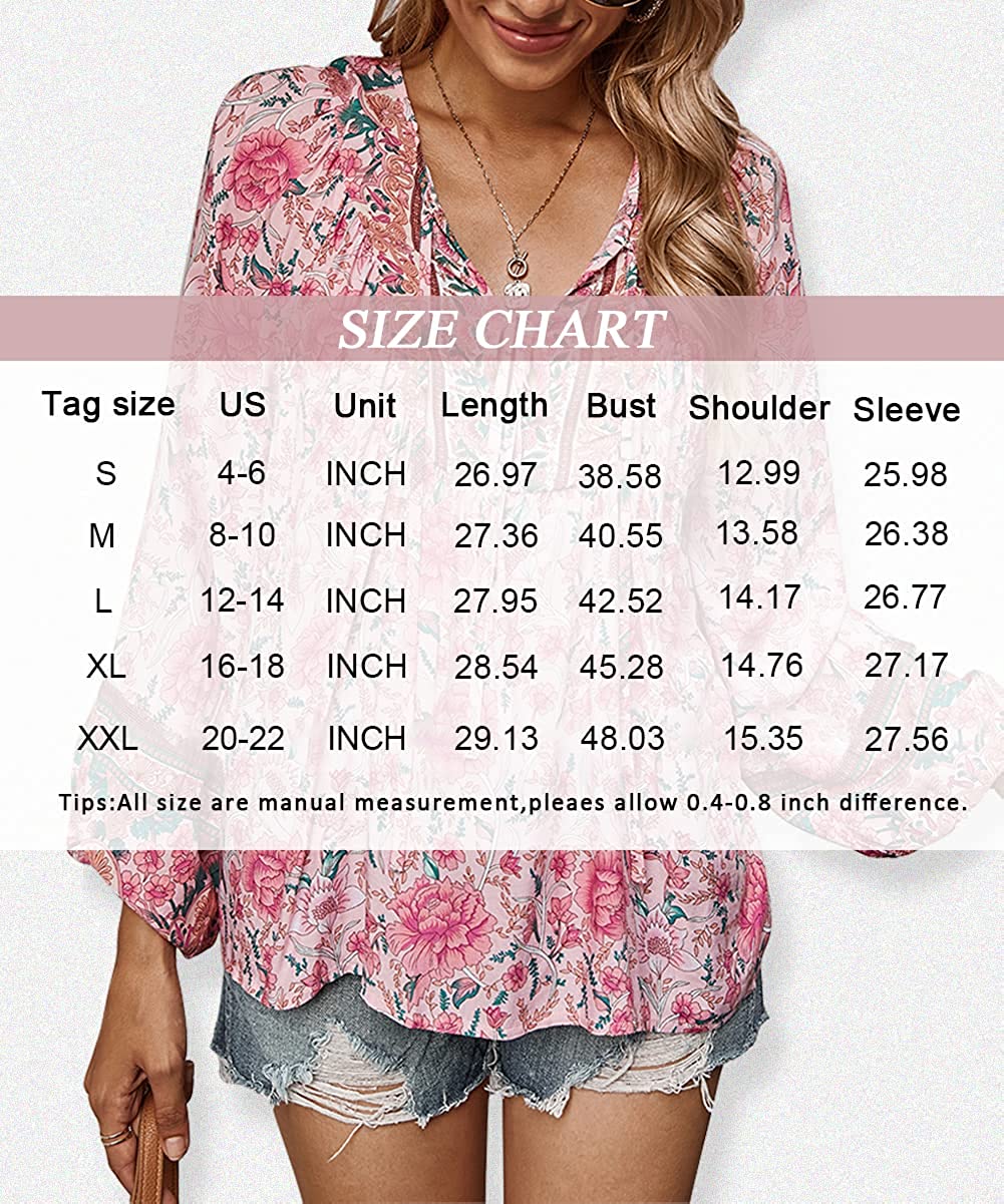 • Features: Fresh and stylish style, sexy v-neck, 3/4 sleeve, elastic cuffs, loose fit, floral print top, decorative buttons, flowy hem, super cute.