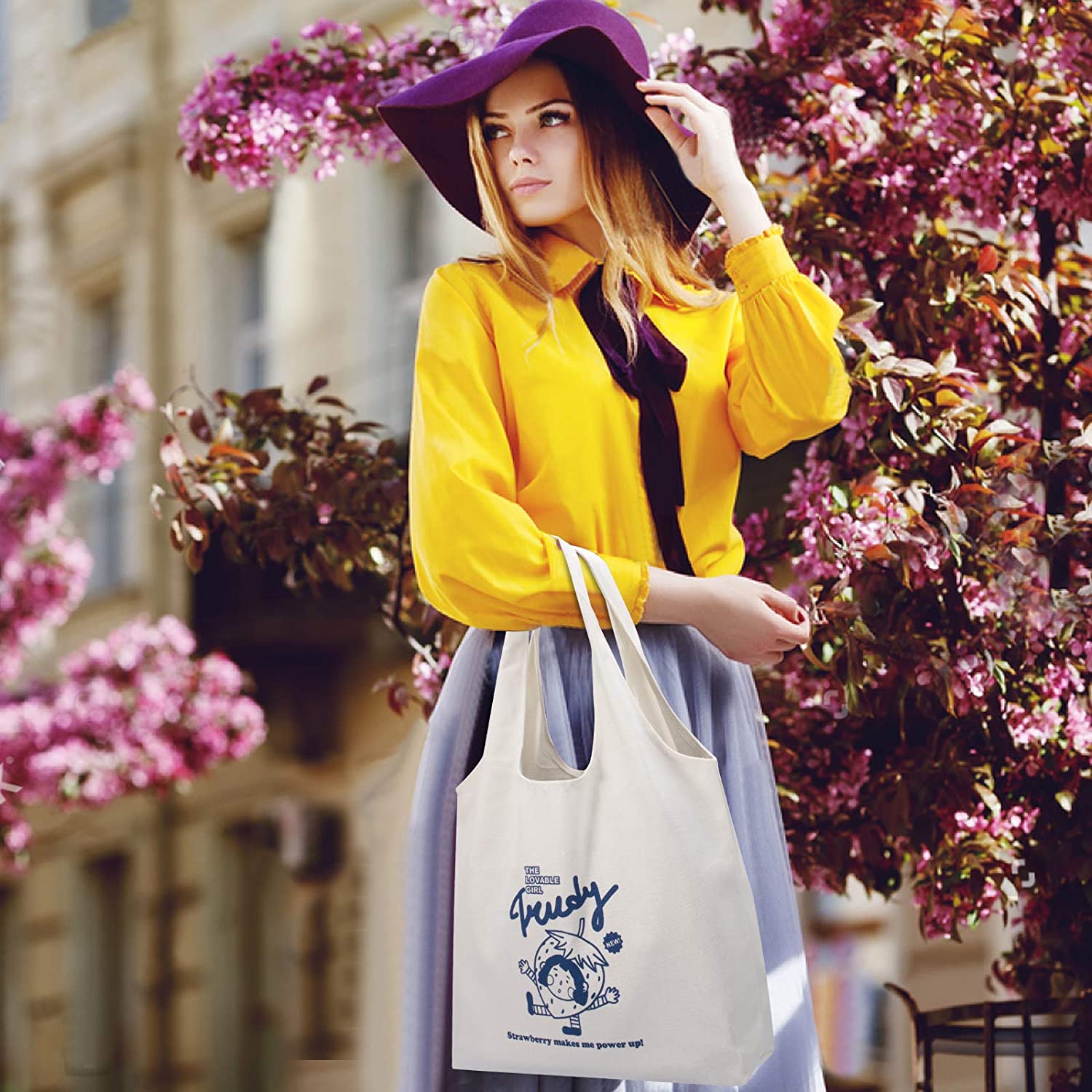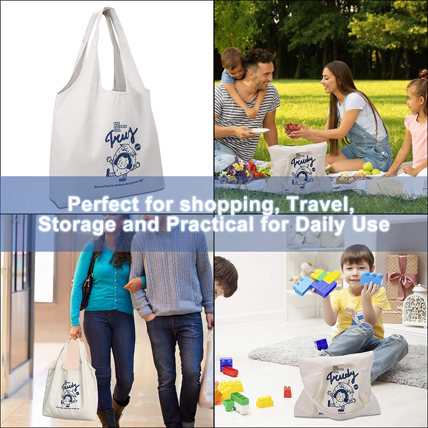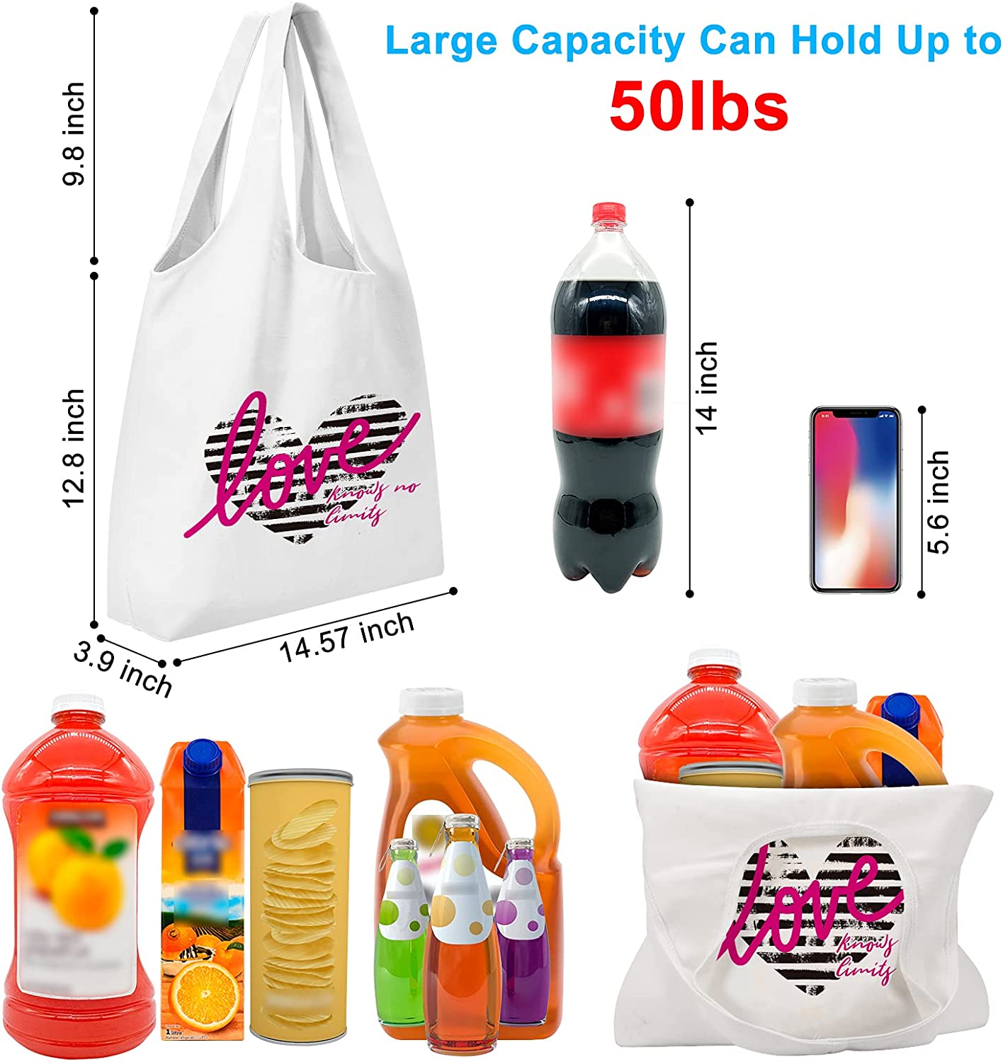 • X-Large Capacity: Canvas tote bags are very big which can hold up to 50+ pounds of groceries and replaces 2-3 conventional grocery bags. Long handles of the reusable shopping bags allow for hand holding or carry on the shoulder for easier carrying. The foldable aesthetic tote bag is perfect for shopping, groceries, travel, storage and practical for daily use.