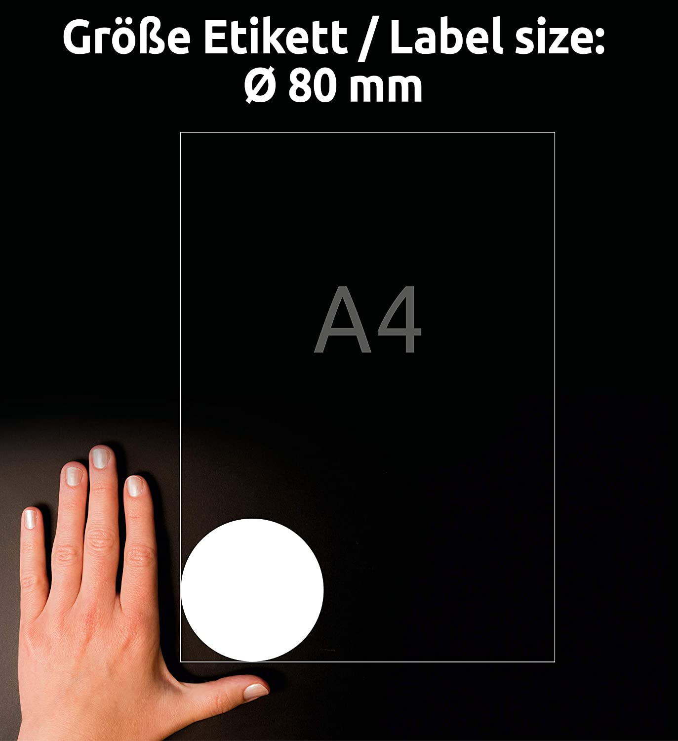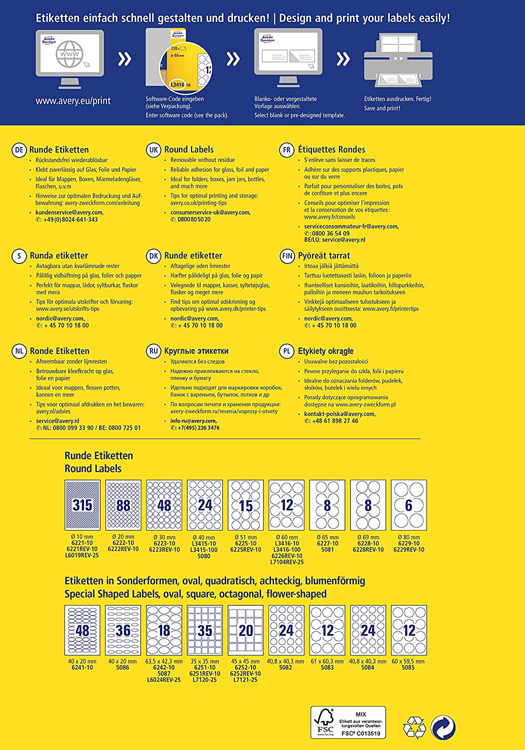 The removable, round labels 6229REV-10 with a diameter of 80 mm from AVERY Zweckform are ideal for striking labelling. The practical small pack contains 60 removable labels on 10 sheets. You can rely on a completely jam free printer run without adhesive deposits in the printer. Environmentally friendly, FSC certified, chlorine-free bleached. Design and print your round stickers quickly and easily with the free Avery Zweckform templates and software solutions. Suitable for all standard laser and inkjet printers, copiers, colour laser printers and colour copiers.