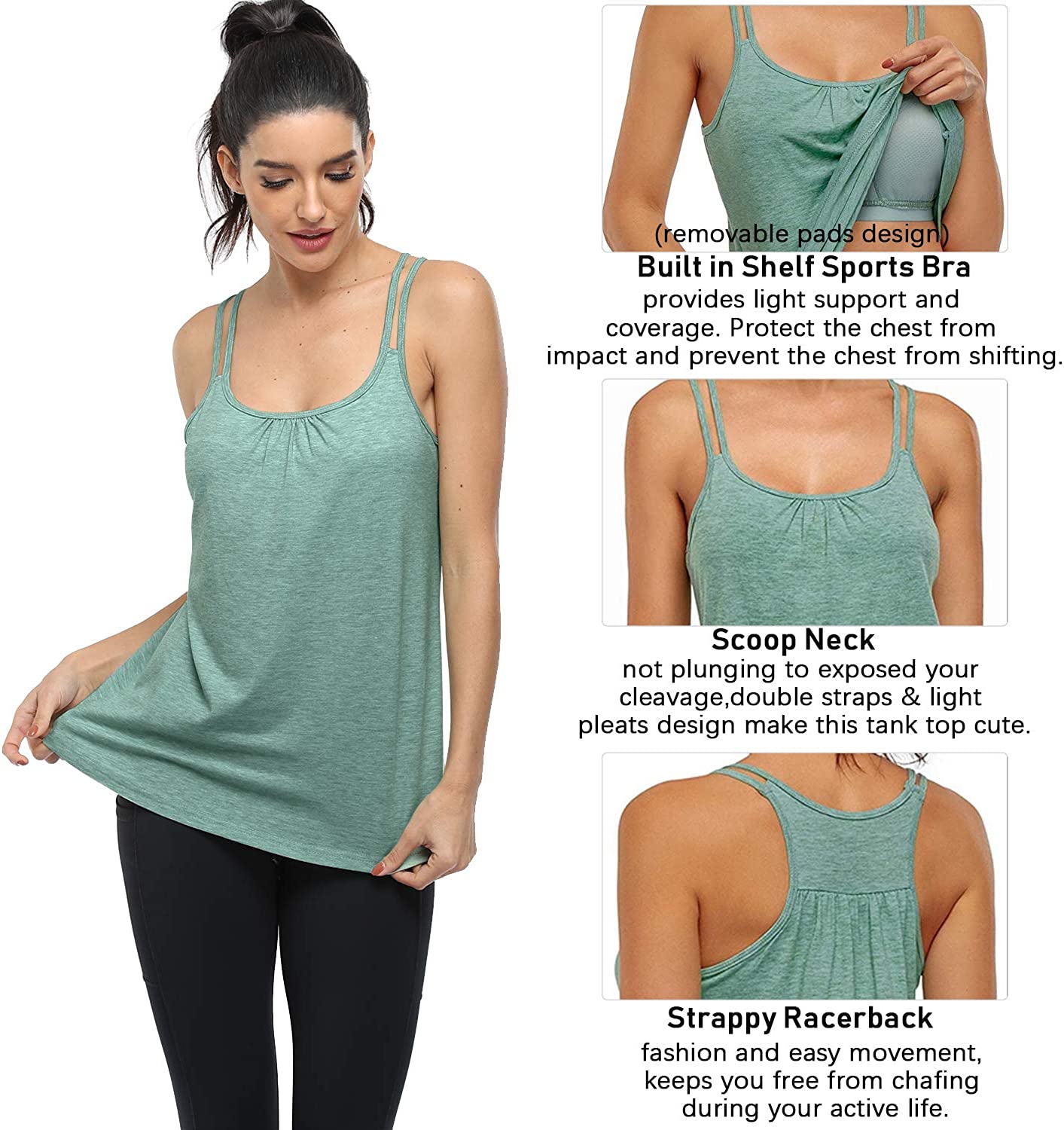 √Built in Bra: Designed for low impact. Shelf bra tank tops built in removable pads gives a comfort feel, provides light support and coverage. You can also take off the pads and wear a sports bra under for high impact.